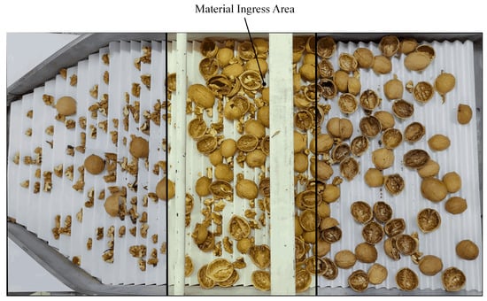 With the continuous increase in walnut planting scale and yield, mechanization of the walnut industry has become an inevitable path. The airflow separation method is currently the main method for shell–kernel separation [1,2,3]. However, due to the overlap in the suspension speeds of 1/2 shell and 1/8 kernel, as shown in Table 1 for the suspension speeds of different components after walnut cracking [4], it is impossible to achieve thorough separation of the shell–kernel mixture using pneumatic separation [5,6]. This not only leads to a significant loss of walnut value but also poses obstacles to the subsequent processing of walnut products. Therefore, achieving the separation of 1/2 shell and 1/8 kernel is key to solving this problem. From the perspective of materials, the geometric differences between 1/2 shell and 1/8 kernel are most significant [7]. Based on this, this study proposes using a toothed groove vibrating screen to achieve the separation of 1/2 shell and 1/8 kernel. Preliminary results demonstrate that this method can effectively achieve the separation of the two, although phenomena of shell retention and kernel loss persist. Revealing the mechanism behind these phenomena is crucial to resolving this issue. Such understanding is of great significance for promoting the full mechanization of the walnut industry.