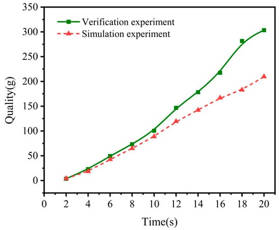Figure 7 is an instantaneous snapshot of the actual screening process. Compared to Figure 3, it can be observed that the overall distribution of materials on the screen surface is basically consistent, which preliminarily indicates that the simulation is quite accurate. To further verify the simulation accuracy, the moment when the material starts to discharge from the outlet is taken as time zero, and a statistical time interval of 2 s is used to record the mass of material discharged from the outlet over time [41,42,43], as shown in Figure 8.