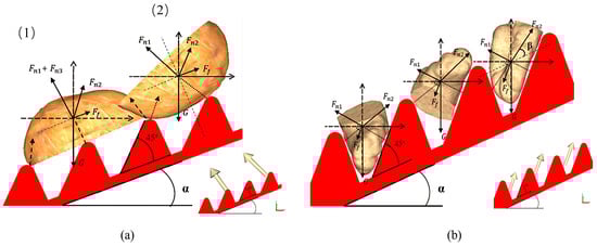 Combining the vector diagrams from the bottom-right corners of Figure 9a,b. it can be observed that when the walnut shell kernel moves on the sieve surface, the resultant force in the Y-axis direction causes the walnut shell kernel to bounce, while the resultant force in the X-axis direction is the primary reason for the separation of the walnut shell kernels. The opposing resultant forces in the X-axis direction promote the relative motion of the walnut shell kernels on the vibrating sawtooth sieve, facilitating their separation.