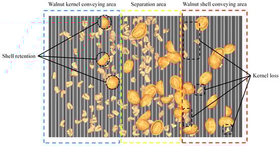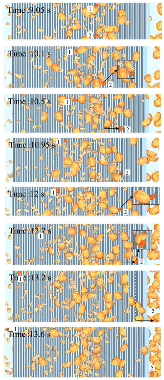 Based on the above research, it has been demonstrated that the mechanism for walnut shell retention and walnut kernel loss is due to the excessive concentration of walnut shell and kernel in the separation area, and the incomplete separation under the action of “enveloping collision” leading to their entry into respective transport areas and resulting in intense collisions that ultimately cause losses. The loss of walnut kernels mainly includes two types: continuous downward loss and alternating upward and downward loss. The retention process of walnut shells generally includes two stages: “enveloping collision” and “thrust collision”.