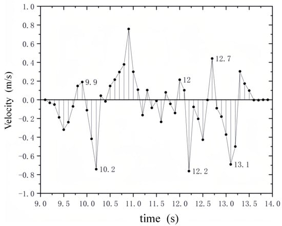 To further validate the mechanism of kernel loss, the velocity of a representative kernel (Particle 2) in the X-direction was analyzed (Figure 14). Particle 2 ultimately reported to the shell collection box (negative X-direction), resulting in kernel loss. Three distinct velocity minima were identified at 10.2 s, 12.2 s, and 13.1 s, each signifying a strong collision that reversed the particle’s direction. These minima correspond to the time intervals of 9.9–10.2 s, 12.0–12.2 s, and 12.7–13.1 s. A direct comparison with the snapshots in Figure 13 confirms that these intervals align with three major collision events experienced by Particle 2 on the screen surface. This correlation conclusively demonstrates that kernel-shell collisions are a primary driver of kernel loss.