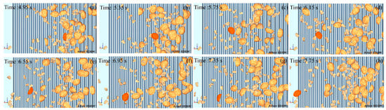 This study exclusively simulates the 1/2 shell and 1/8 kernel. Based on actual production conditions, a feed rate of 40 g/s was found to be efficient; therefore, an equal mass of 1/2 shell and 1/8 kernel is generated, resulting in an output rate of 20 g/s each. To ensure uniform mixing of walnut shell and kernel materials, a particle factory was set up as a virtual cube with dimensions of 100 mm × 50 mm × 260 mm, generating both 1/2 shell and 1/8 kernel materials. A hollow box with dimensions of 700 mm × 500 mm × 280 mm was established as the calculation domain. The calculation domain mainly includes a walnut shell and kernel collection box and a toothed vibrating screen. The size of the walnut shell and kernel collection box is 150 mm × 150 mm × 280 mm. Due to the varying sizes of walnuts, which follow a normal distribution trend, the model size was set to fluctuate between 0.85 and 1.15 times. The vibration direction angle was set to 45°, the amplitude to 6.8 mm, the vibration frequency to 12 Hz, and the screen surface inclination angle was set to 16~26°, with each 2° serving as a group for simulation [33]. In EDEM, the fixed time step was set to 20% of the Rayleigh Time, and the position, velocity, contact, and collision of particles were automatically recorded every 0.01 s for a simulation time of 20 s. As shown in Figure 3, a random screenshot illustrates the separation simulation process of the 1/2 shell and 1/8 kernel.