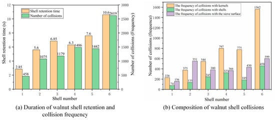 To validate the universality of the aforementioned viewpoint, we conducted statistics on the retention duration and collision frequency of six retained walnut shells during the simulation process, as shown in Figure 17. From Figure 17a, it can be observed that the collision frequency is positively correlated with the retention duration. Among the six retained walnut shells, the shortest retention time is 2.85 s for the first shell, and the longest retention time is 10.6 s for the sixth shell. In terms of collision frequency, the first shell has the fewest collisions with 458 times, while the sixth shell has the most with 2619 times. From Figure 17b, it can be seen that collisions between the shell and the kernel account for 51.8% of the total collisions in the composition of collisions for the retained shells. These results are consistent with the findings in Figure 15 and Figure 16, further proving that the “enveloping collision” between the shell and the kernel is the main reason for their retention.