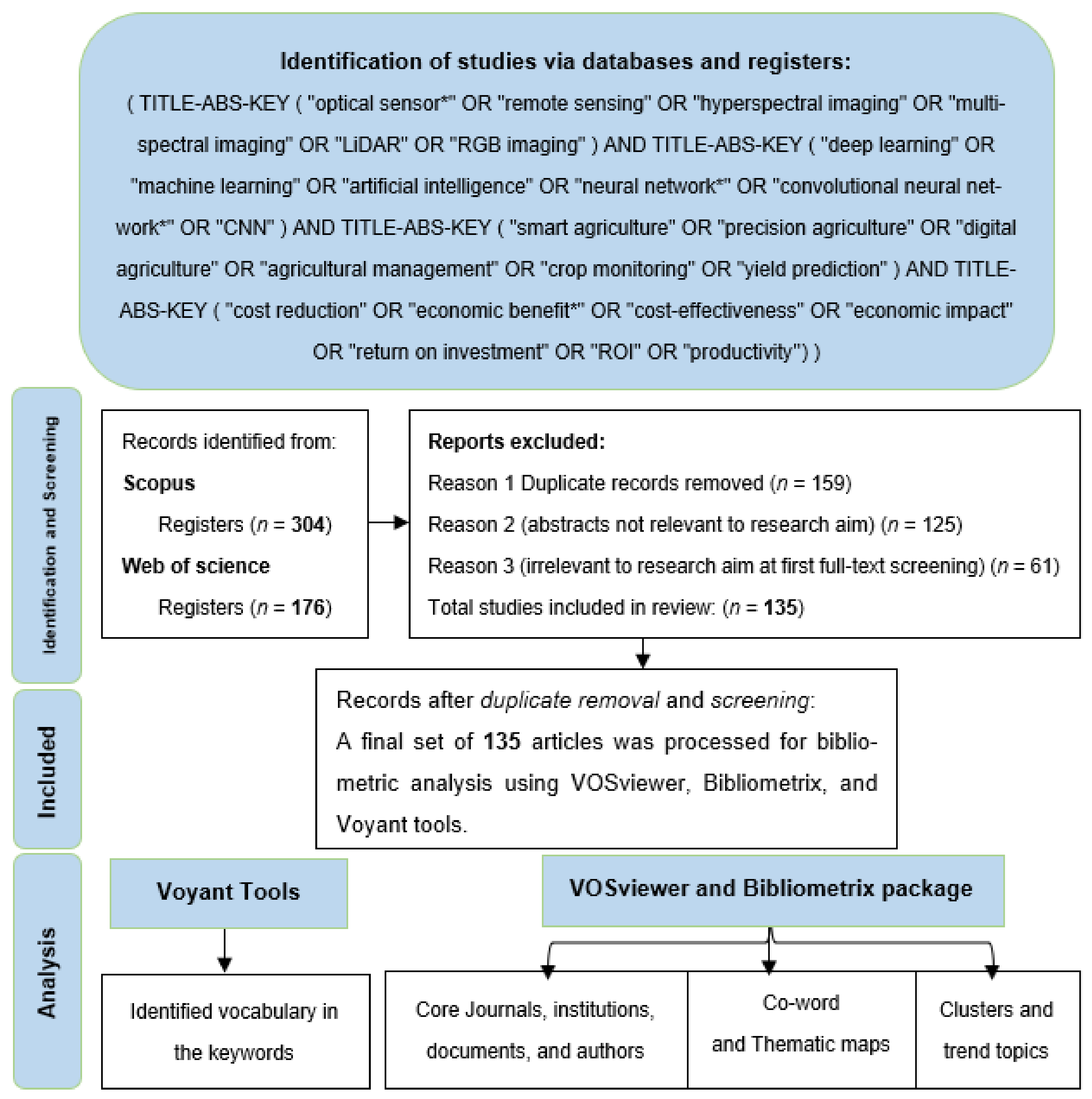 It is important to note that the systematic reduction from an initial pool of 480 documents to the final 135 (72% exclusion rate) reflects the emerging and interdisciplinary nature of this research field. Many of the excluded studies addressed either optical sensors or deep learning independently, rather than focusing on their integrated economic implications in agriculture. This rigorous filtering process ensures concentration on economically relevant technological convergence, highlighting the scarcity of studies that comprehensively evaluate both technological performance and measurable economic outcomes in agricultural settings. Such methodological refinement aligns with recent scientometric approaches emphasizing thematic precision and coherence in dataset selection [