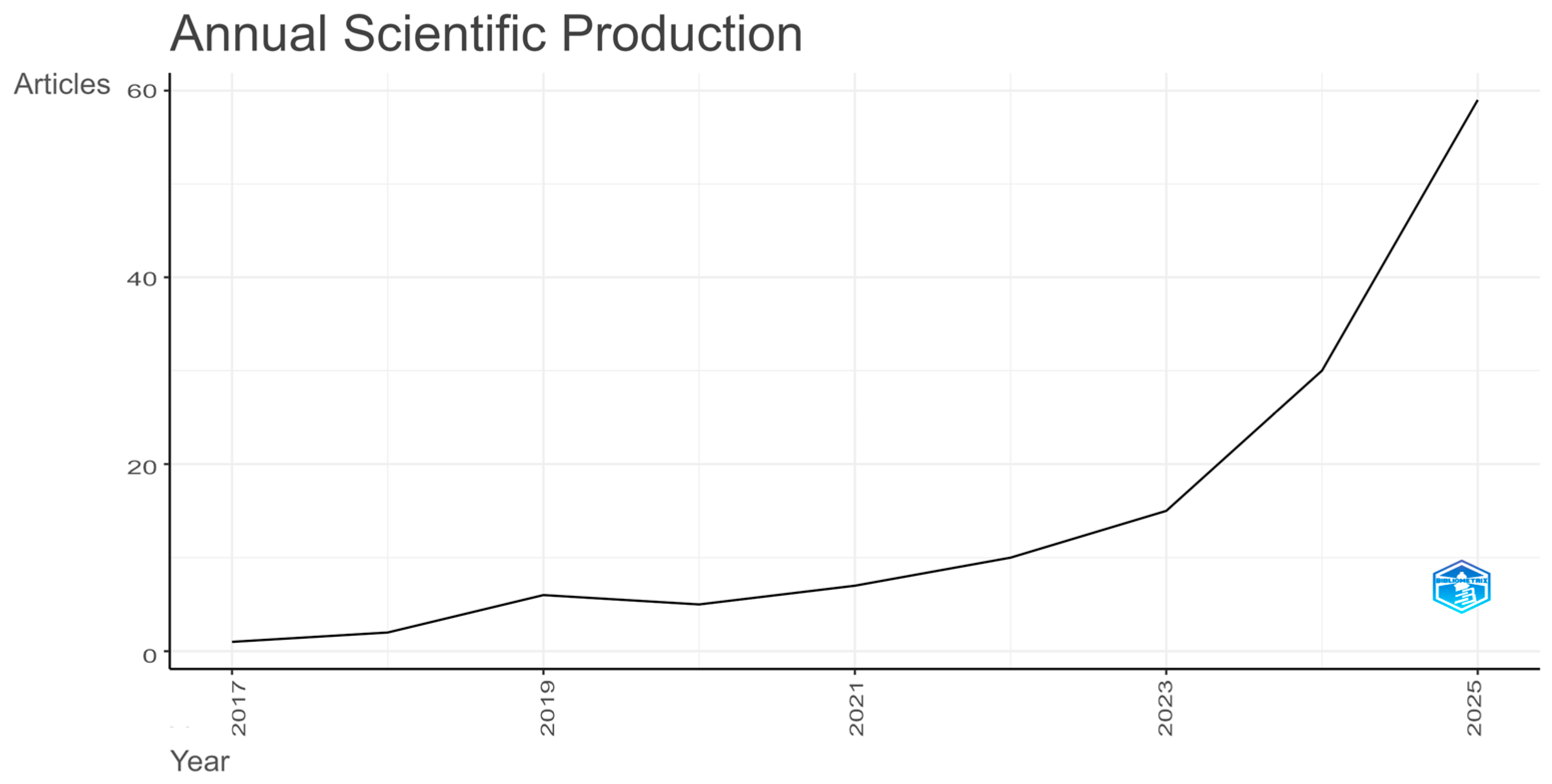 The temporal analysis reveals remarkable growth in scientific interest, with an annual growth rate of 66.48% between 2017 and 2025, culminating in nearly 60 publications by June 2025; this issue was addressed by answering RQ1. This growth aligns with quadratic polynomial increases of up to 91% per year in machine learning publications for sustainable agriculture [