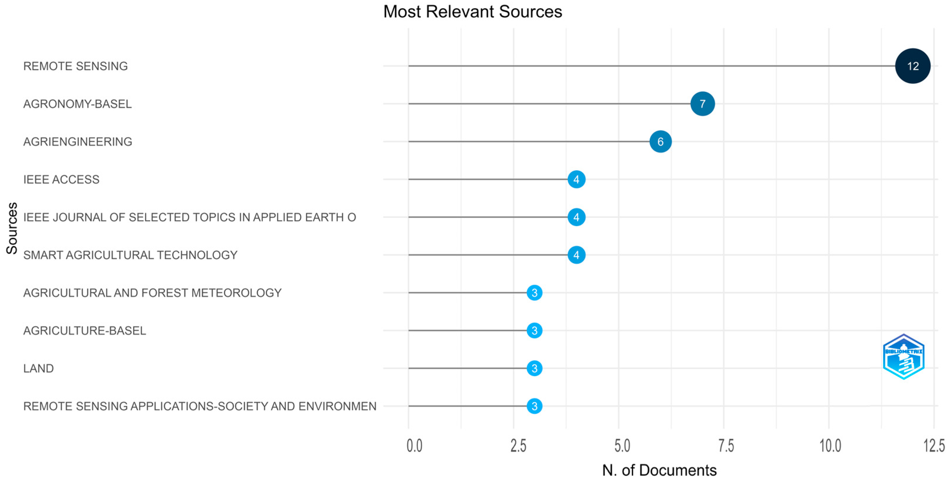 Figure 3 shows the main journals where research on the economic impact of optical sensors and deep learning in smart agriculture has been published. Remote Sensing leads with 12 articles, followed by Agronomy-Basel and Agriengineering, which points to a strong focus on environmental monitoring and agricultural technology. The presence of journals like IEEE Access and Smart Agricultural Technology highlights the growing role of engineering and computing in this field. Overall, the figure illustrates how different areas—agriculture, technology, and environmental science—come together in this research, and it helps identify the leading platforms where related studies are being shared.