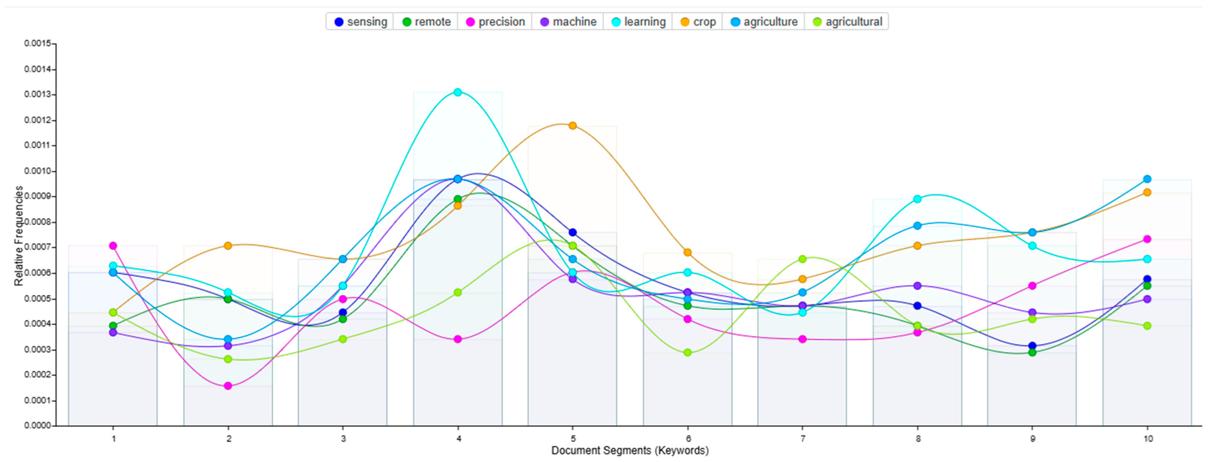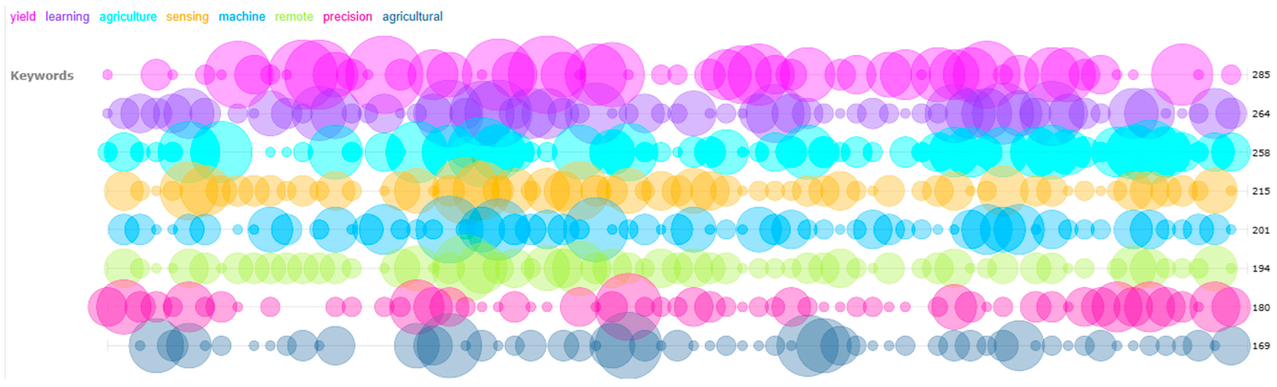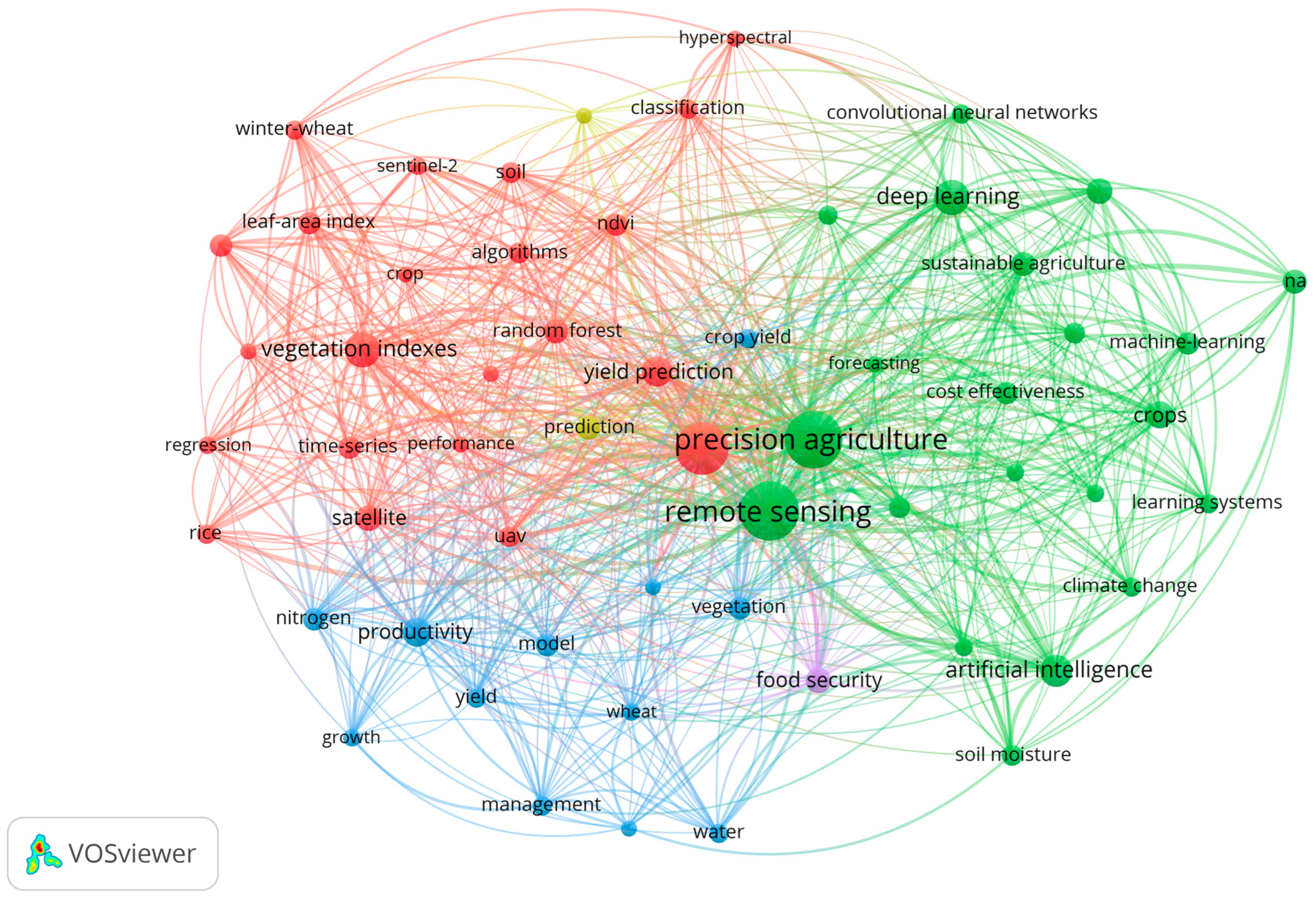Three dominant thematic areas emerge: precision agriculture and remote sensing applications, prediction and soil analysis systems, and vegetation indices and productivity metrics; this issue was addressed by answering RQ3. The co-occurrence network analysis identifies corresponding clusters with precision agriculture and remote sensing as conceptual anchors, demonstrating economic significance through UAV sensing systems providing low cost, high spatio-temporal resolutions, and automation functions [