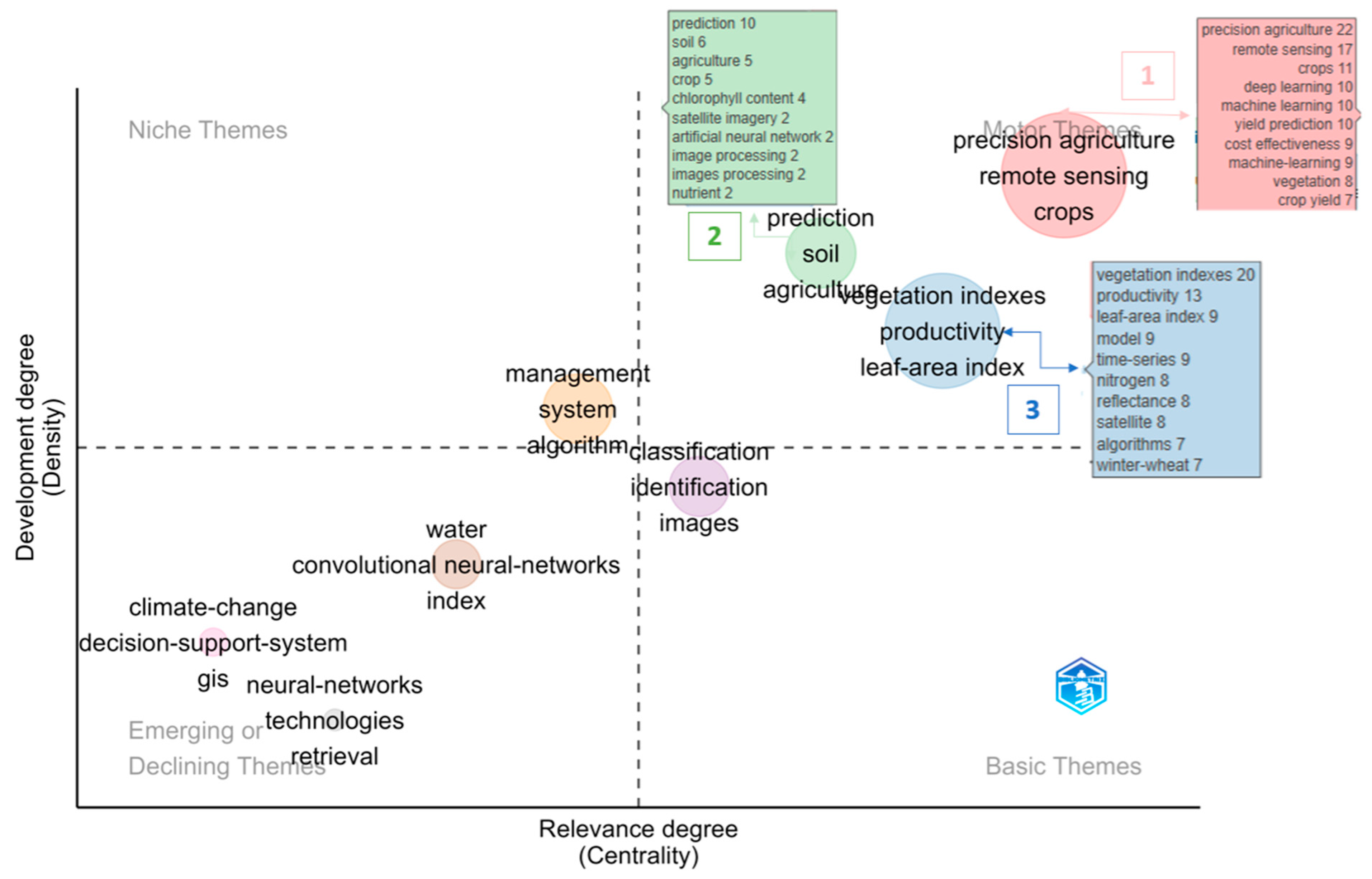 This thematic decomposition confirms the increasing academic interest in applied technologies for agricultural efficiency and economic return. The prominence of prediction, productivity, and remote sensing within central and motor themes highlights their vital role in transforming farming into a data-driven, cost-effective enterprise, as evidenced by the transition from traditional farm practices to highly automated and data-intensive industries where artificial intelligence-based techniques, together with big data analytics, address agricultural production challenges in terms of productivity and sustainability [
