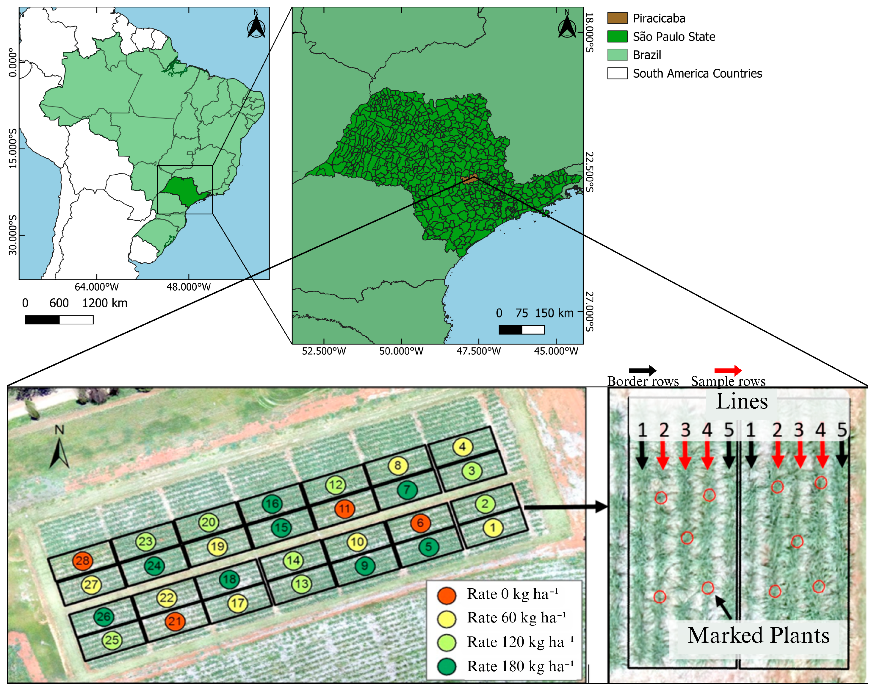 - Yang, Y.; Gao, S.; Jiang, Y.; Lin, Z.; Luo, J.; Li, M.; Guo, J.; Su, Y.; Xu, L.; Que, Y. The Physiological and Agronomic Responses to Nitrogen Dosage in Different Sugarcane Varieties. Front. Plant Sci. 2019, 10, 406. [Google Scholar] [CrossRef]