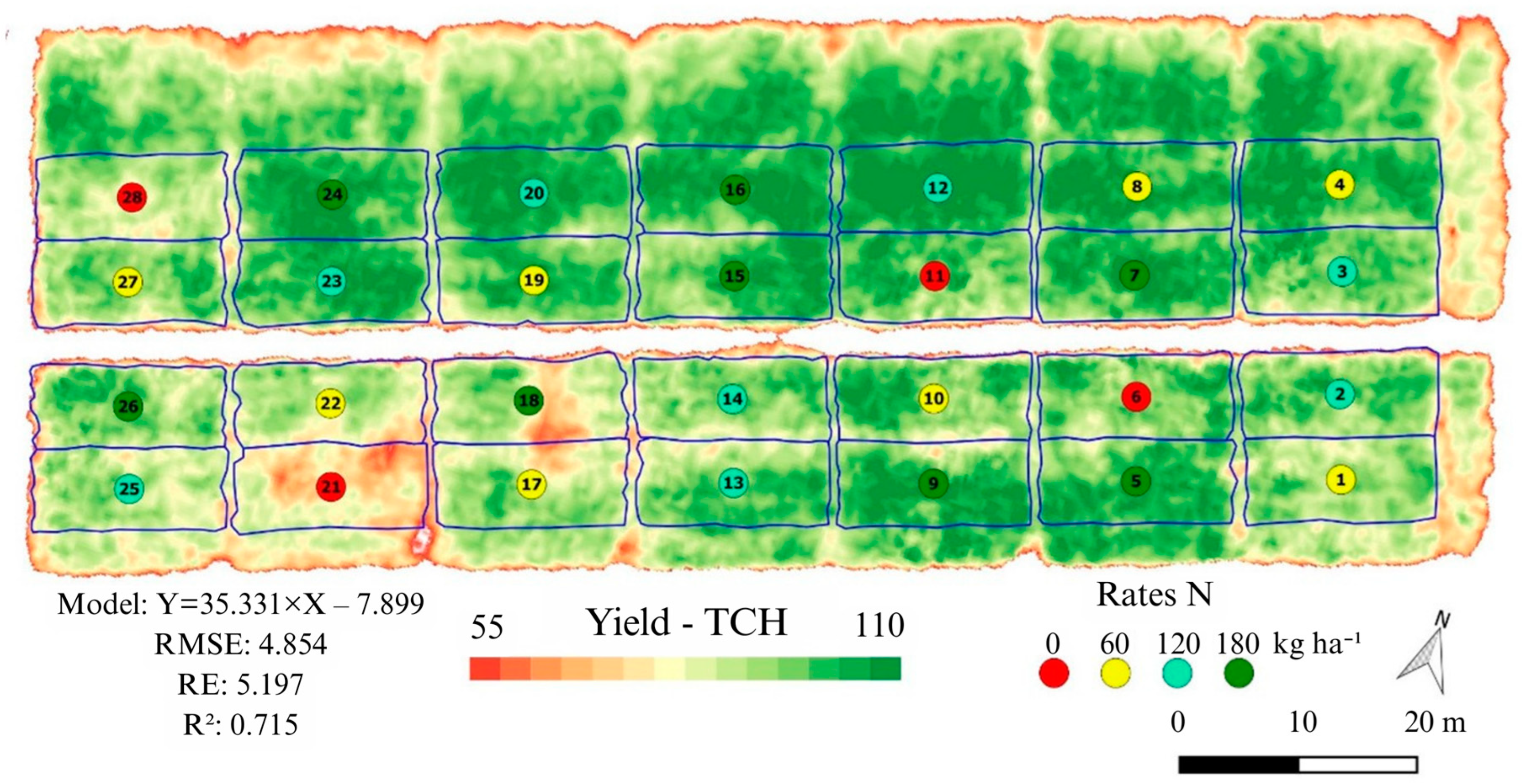 - Alexandre, M.L.d.S.; e Lima, I.d.L.; Nilsson, M.S.; Rizzo, R.; Silva, C.A.A.C.; Fiorio, P.R. Sugarcane (Saccharum officinarum) Productivity Estimation Using Multispectral Sensors in RPAs, Biometric Variables, and Vegetation Indices. Agronomy 2025, 15, 2149. [Google Scholar] [CrossRef]