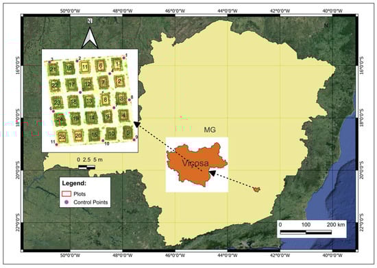 Geographic location of the experimental area in Viçosa, Minas Gerais, Brazil. The experimental site covers 0.7 ha and was divided into 25 plots of 12 m2 each, cultivated with Urochloa decumbens. The inset map illustrates the spatial layout of the plots and ground control points used for image georeferencing, with plots shown in red and control points in purple.