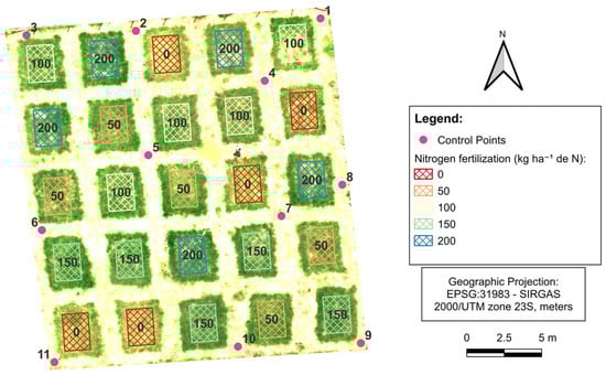 Gradient of nitrogen fertilization in the experimental area. The different colors indicate the nitrogen application rates (0, 50, 100, 150, and 200 kg ha−1 of N), while the purple points represent the control points used for image georeferencing. The cartographic projection adopted was EPSG:31983—SIRGAS 2000/UTM zone 23S.