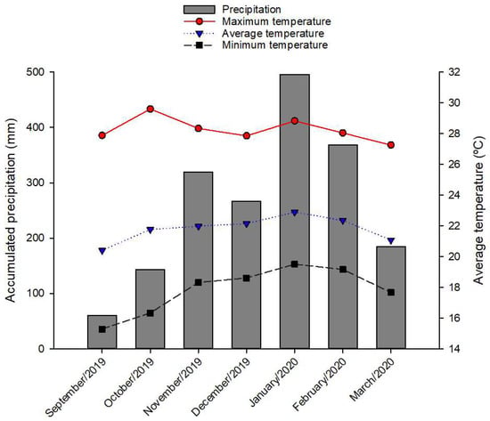 Monthly accumulated precipitation (mm) and maximum, average, and minimum temperatures (°C) in Viçosa, Minas Gerais, Brazil, between September 2019 and March 2020. Data were obtained from the Viçosa Weather Station. Bars represent monthly accumulated precipitation, and lines indicate temperatures.