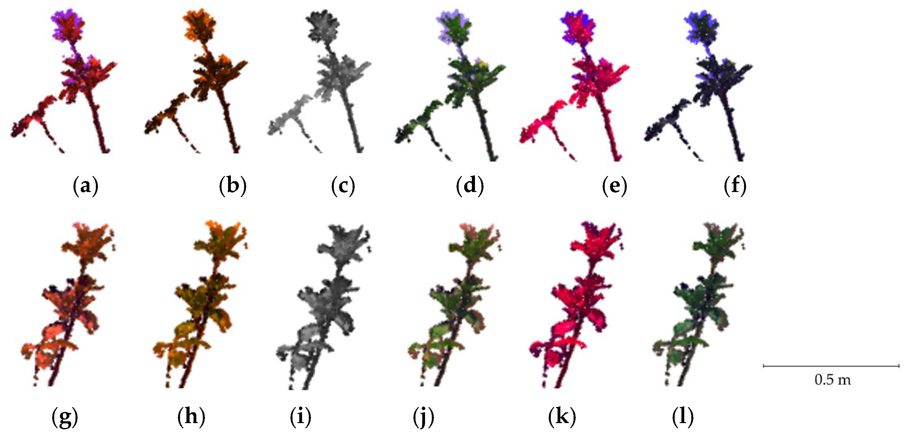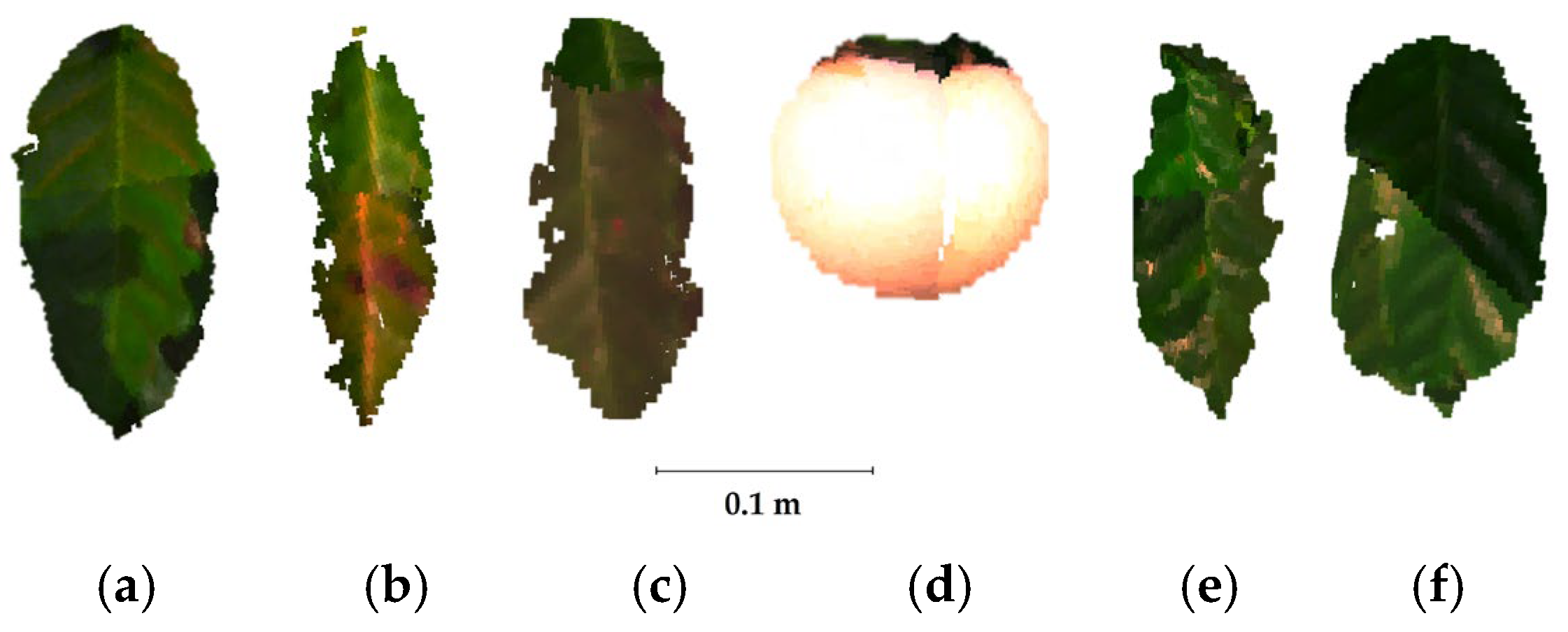 - Xie, P.; Du, R.; Ma, Z.; Cen, H. Generating 3D Multispectral Point Clouds of Plants with Fusion of Snapshot Spectral and RGB-D Images. Plant Phenomics 2023, 5, 40. [Google Scholar] [CrossRef]