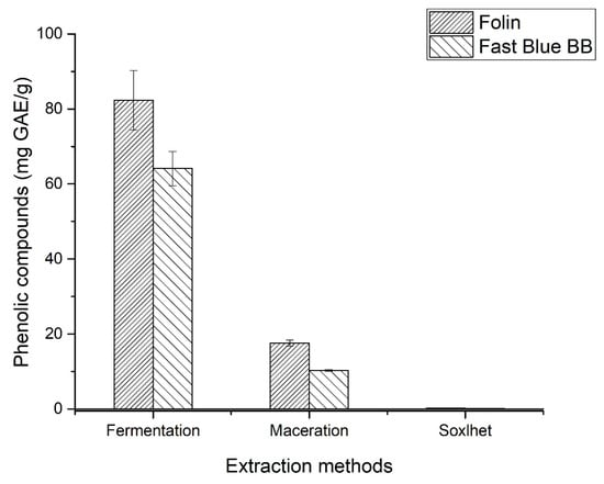 In the extraction performed by submerged fermentation with B. licheniformis SMIA2, 82.3 mg GAE/g of sample were quantified by the Folin–Ciocalteu method. In comparison, the Fast Blue BB method indicated 64.1 mg GAE/g. Compared to the study of Zang et al. [30], who used Bacillus subtilis in submerged fermentation to extract phenolic compounds from corn flour, the results obtained with B. licheniformis SMIA2 in this study demonstrated superior yield.