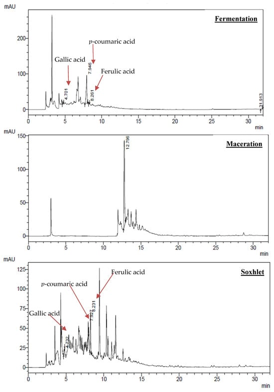 The chromatograms (Figure 2) obtained for the samples extracted by submerged fermentation and the Soxhlet method exhibited peaks with retention times compatible with the standards of gallic acid, ferulic acid, and p-coumaric acid, confirming the presence of these phenolic compounds in the analyzed samples. These results agree with the literature, which indicates that p-coumaric and ferulic acids are predominant in the pineapple crown and other compounds derived from these acids [30].