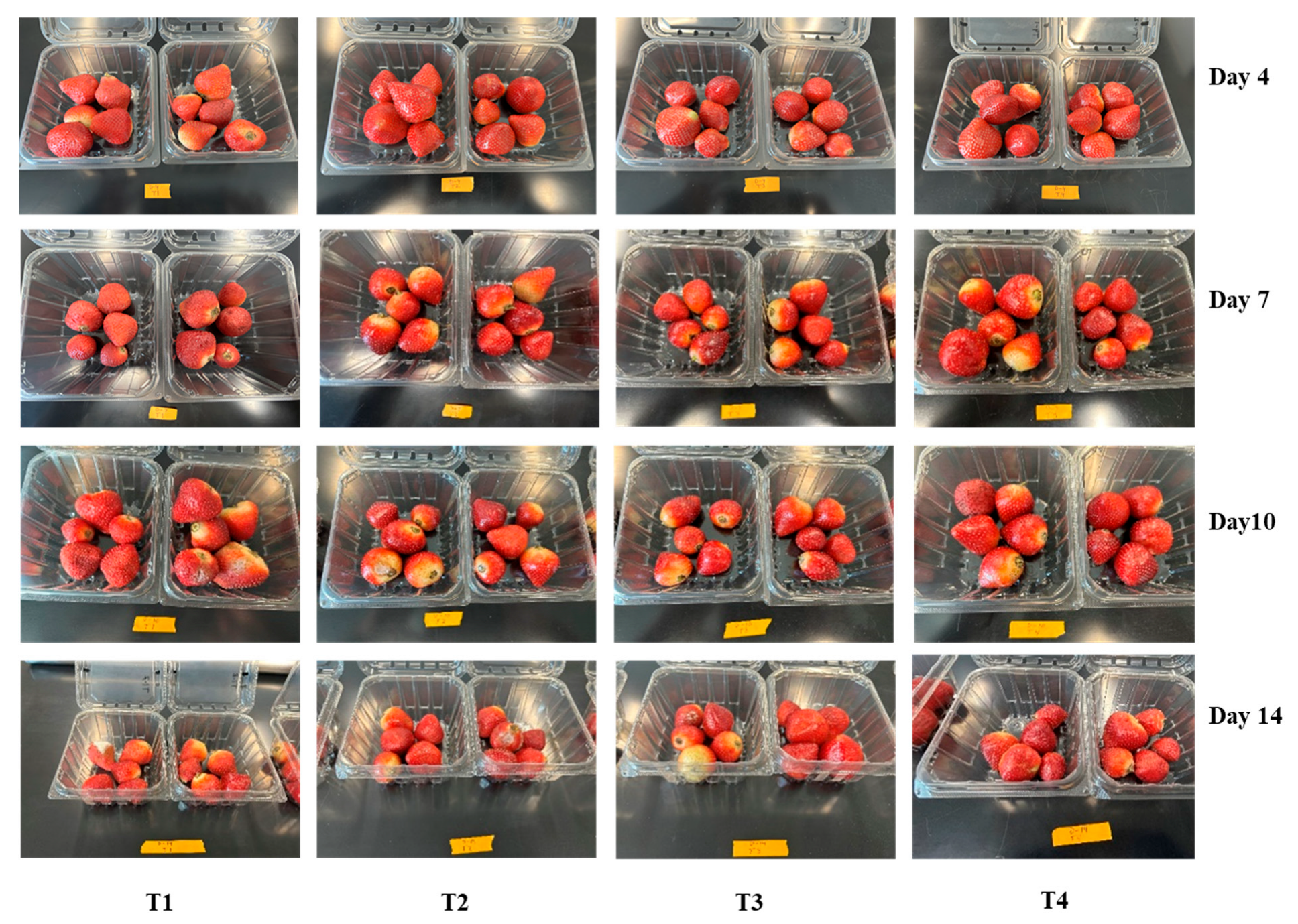 Strawberries of commercial maturity, uniform size (~35 mm average diameter), and without any damage or decay were selected and transported to the laboratory immediately. The strawberries were first washed with tap water to remove any adhering dirt and soil. After washing with tap water, strawberries were sanitized with 0.05% (w/v) sodium hypochlorite solution and then again rinsed with tap water. The cleaned strawberries were placed on a metal wire mesh and dried with the help of a fan. After being dried completely, strawberry samples were dipped into different BW starch film solutions for 5 min, drained, and air-dried at room temperature (22 ± 1 °C) using a fan until the coating layer was dry. Then, the control and coated fruits were subjected to packaging and storage. Table 2 displays detailed information on the treatments/film solutions. Coated strawberries were packaged in clamshells (5 fruits/box, 3 boxes per treatment) and stored at 4 ± 1 °C and 82 ± 1% RH in an environmental chamber (Heratherm, Thermo Scientific, Waltham, MA, USA). To evaluate the effect of coating treatments on the shelf life and quality of strawberries, physicochemical studies were carried out on each sampling day—days 0, 4, 7, 10, and 14. Figure 1 shows the visual appearance of coated strawberries over the storage period.