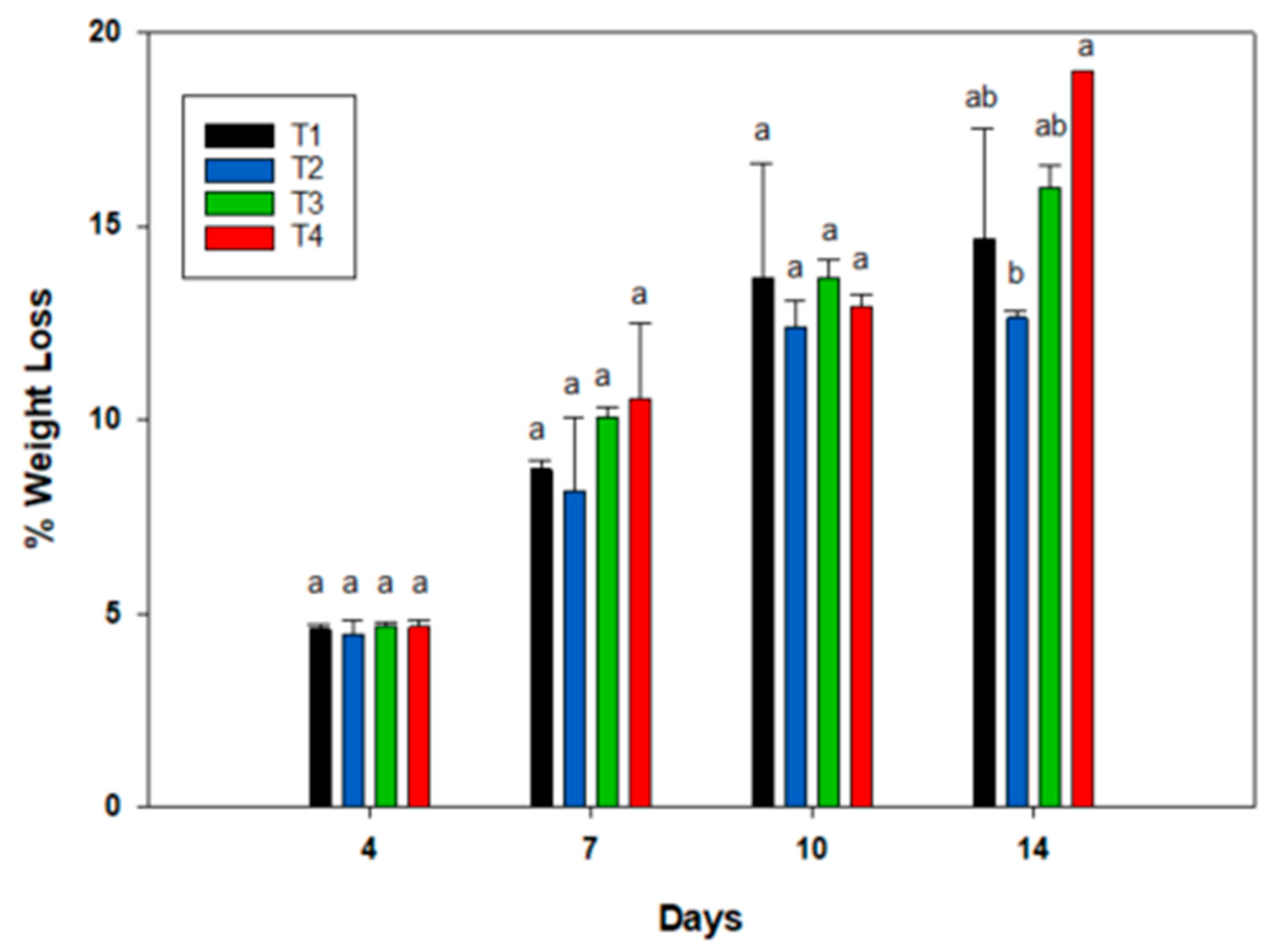 Weight loss was significantly (p < 0.05) affected by the treatment and storage duration, with no significant interaction between these two independent variables (Table 3). As shown in Figure 2, the weight loss of the strawberries increased with increasing storage. T2, i.e., the BW starch-coated fruits, had the least weight loss throughout the storage period. However, T1 with no coating treatments, as well as T3 and T4 with BW starch, CA, and CNP, and ultrasonicated BW starch, CA, and CNP, respectively, had consistently higher weight loss during storage. At the end of the storage duration, T4 strawberries had significantly higher (p < 0.05) weight loss compared to the T2-treated fruits (Figure 2). BW starch-coated fruits (T2) had 16% reduced weight loss compared to the uncoated counterpart (T1) on day 14.