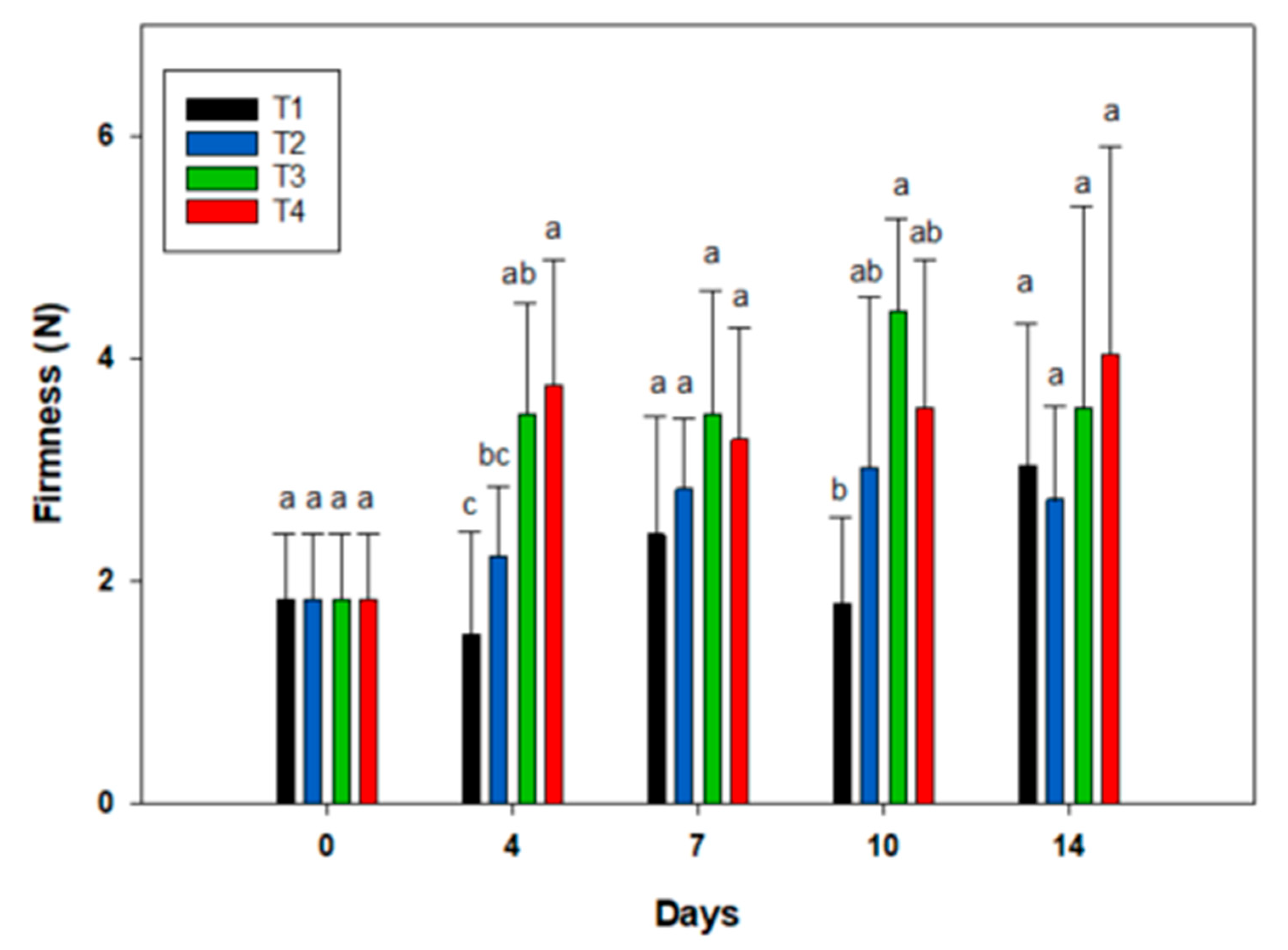 The reduced hardness of control fruits may be attributed to accelerated water loss, ripening, and senescence [27,33]. The reduced moisture loss resulting from the barrier properties of BW starch could be attributed to the hardness of coated fruits [11]. Even though T3 fruits had more moisture loss than T2 fruits, T3 fruits possessed higher hardness. This could be due to reduced ripening and/or a thicker coating material. Hardness is the peak force of the first compression that indicates the strength of the structure [22]. The BW starch coating, especially T3, with added CA and CNP, might have formed a stronger and thicker layer on the strawberry surface, contributing to its hardness. Nonetheless, at the end of storage, T4 fruits’ reduced hardness compared to T2 may be attributed to increased water loss (Figure 2), resulting in reduced cell turgor. Chewiness is positively correlated with hardness and springiness and indicates the mastication energy required to process a solid food in the mouth [22]. Therefore, looking into the hardness and springiness data, the higher chewiness in the coated fruits, especially in T3 samples, may be primarily due to the higher hardness attributed to the coating material. The TPA results suggest that microbial spoilage and the atmospheric composition inside the packages may have affected the quality of the control fruits [34].