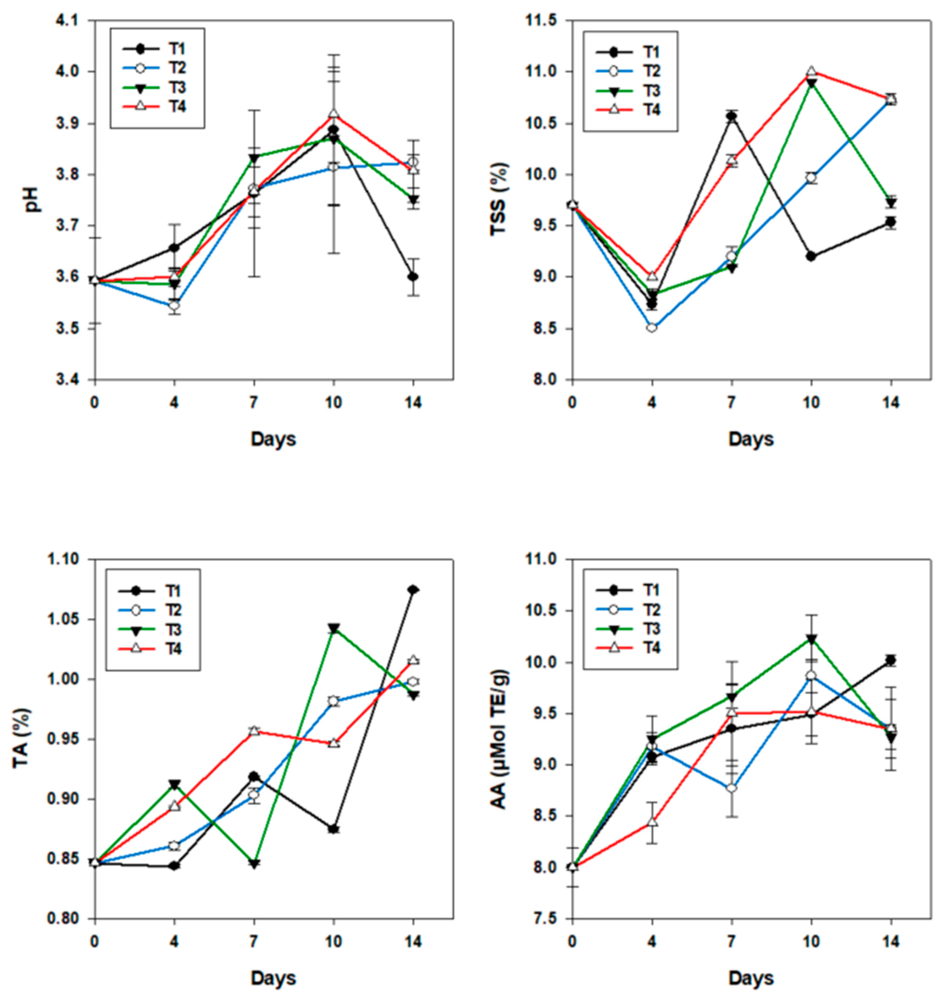 Table 6 shows that both the treatment and storage duration had significant effects (p < 0.05) on strawberry pH, TSS, TA, and AA. Moreover, the interaction of these two independent variables was found to be significant for all dependent variables, except pH changes. Figure 4 shows that there was a rapid increase in pH levels in all samples until day 10, followed by a sharp decline at the end of the storage, except for T2. The control sample exhibited the lowest pH (p < 0.05) at day 14, while the T2 samples were the most stable. However, pH values among the BW starch-coated samples were non-significant (p > 0.05). As far as the TA is concerned, there was a gradual increase in TA in the T2 and T4 samples during storage. On the other hand, the TA of the control and T3 samples fluctuated, with the control samples possessing the highest TA (p < 0.05) at the end of the storage. Like TA, the TSS of T2 and T4 samples increased during storage, while it was unstable for T1 and T3 samples. The TSS of the control samples was significantly (p < 0.05) lower after the 10th day of storage. Overall, the BW starch-coated samples, especially T2 and T4, had better control over the chemical changes in strawberries during storage. The highest level of AA was observed in T3 samples until day 10, which was followed by a reduction at the end of storage. However, ultrasound treatment appeared to have a negative influence on the AA of strawberries; T4 samples, which were the ultrasonicated counterparts of T3, possessed reduced AA compared to T3. All BW-starch-coated fruits followed a similar trend of reduced AA after 14 days. However, the control samples demonstrated a steady increment in AA throughout storage.