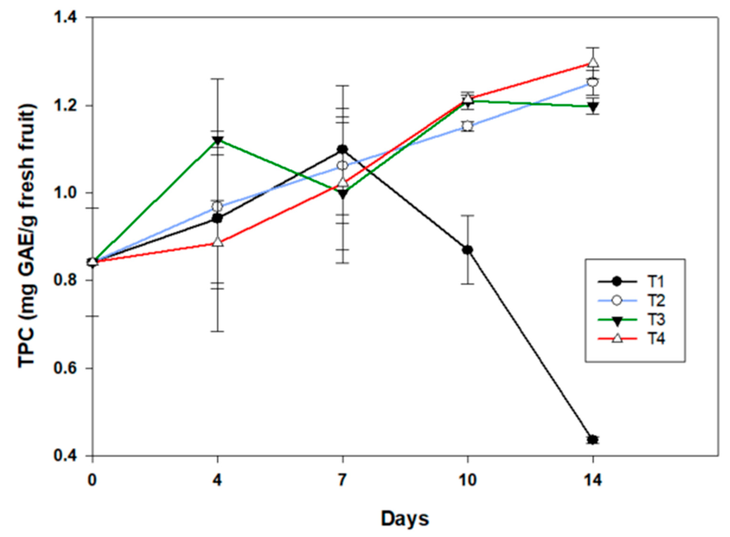 Changes in the TPC of strawberry fruits were observed during the storage period and are shown in Figure 5. TPC was significantly (p < 0.05) affected by treatment, but the storage duration effect was not significant (p > 0.05); however, their interaction was significant (p < 0.05) (Table 6). TPC in starch-coated fruits exhibited an increase in storage. On the other hand, control fruits had a significantly (p < 0.05) reduced TPC starting at day 10 and reached 0.44 mg GAE/g at the end of storage. Treated fruits did not significantly (p > 0.05) differ until day 10, and at the end of storage, T4 samples had a significantly (p < 0.05) higher TPC (1.3 mg of GAE/g) than T3 and control fruits.