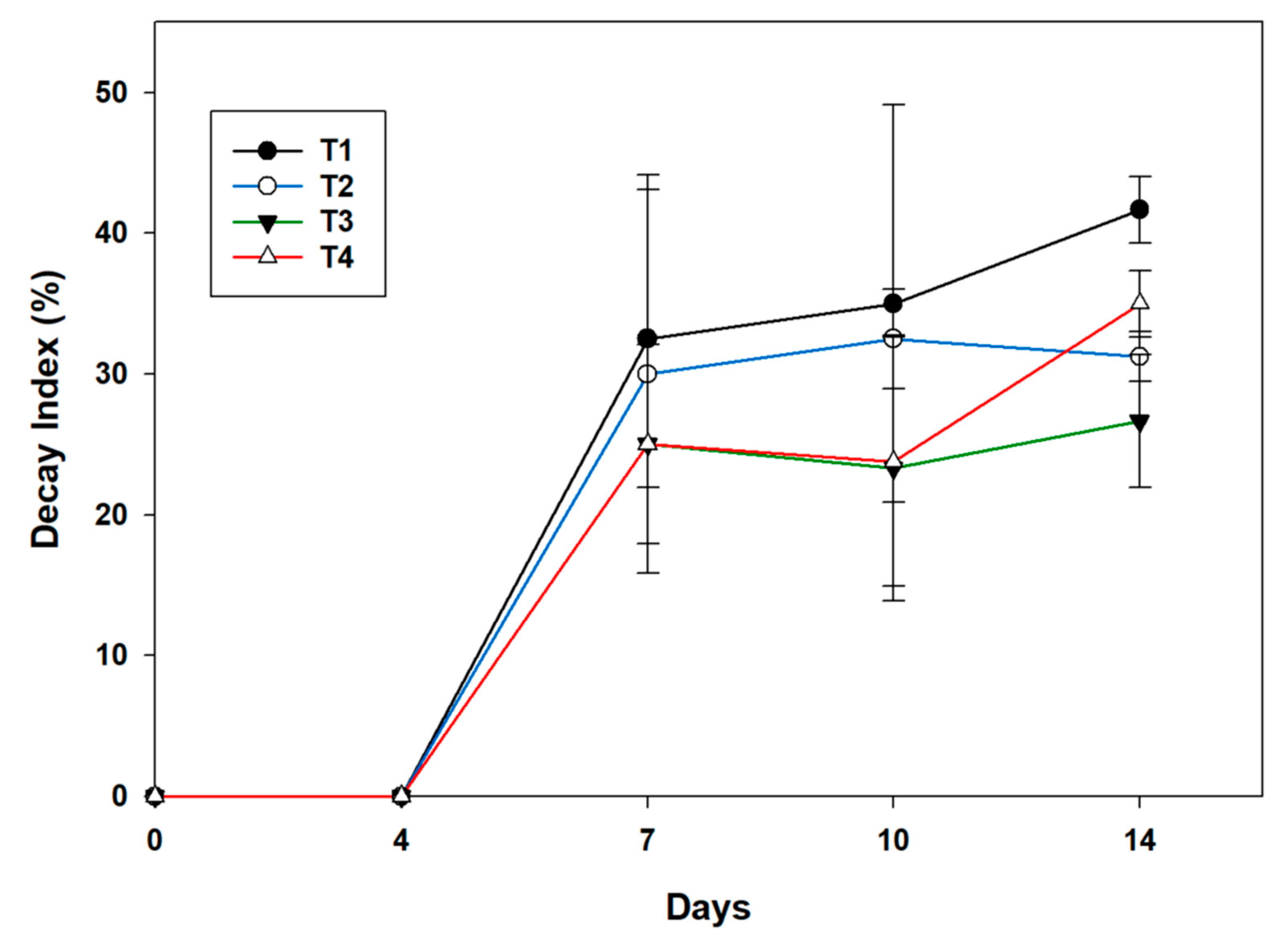 The cleaning and sanitation process followed during the sample preparation step might have restricted the decay process in all samples during the first few days [18]. Reduced senescence in BW starch-coated fruits might have slowed down the decay process. Fruits and vegetables become susceptible to pathogenic organisms on the verge of senescence due to the loss of cellular structure and weakening of tissues [18]. The reduced % DI in T3-coated samples could be attributed to the antimicrobial activity of CA [50] and CNP [51].