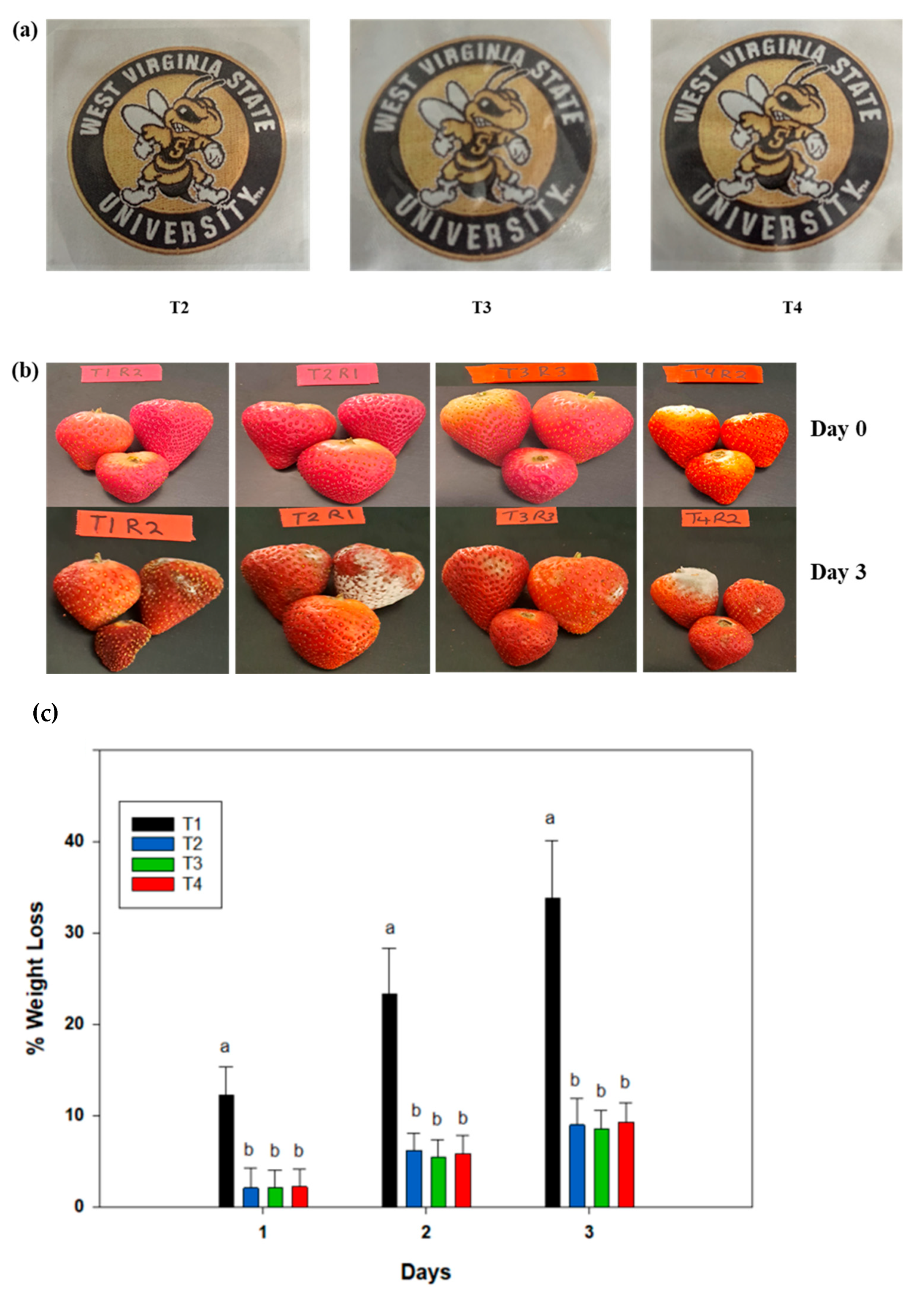 Figure 7a shows the physical appearance of the films as it relates to film transparency. Ultrasonicated film (T4) appears to be more transparent than other films. CA and CNP increased the film (T3) opacity. Figure 7b shows the appearance of strawberries on day 0 and day 3, which demonstrates clear signs of decay in every treatment except T3. Nevertheless, as shown in Figure 7c, exposed strawberries had significantly greater moisture loss than samples packaged with BW starch films. In fact, the packaged samples had >10% moisture loss after 3 days of storage. The moisture loss of strawberries with or without the BW starch film package was significantly (p < 0.05) affected by treatment, storage duration, and their interaction (Table 6).