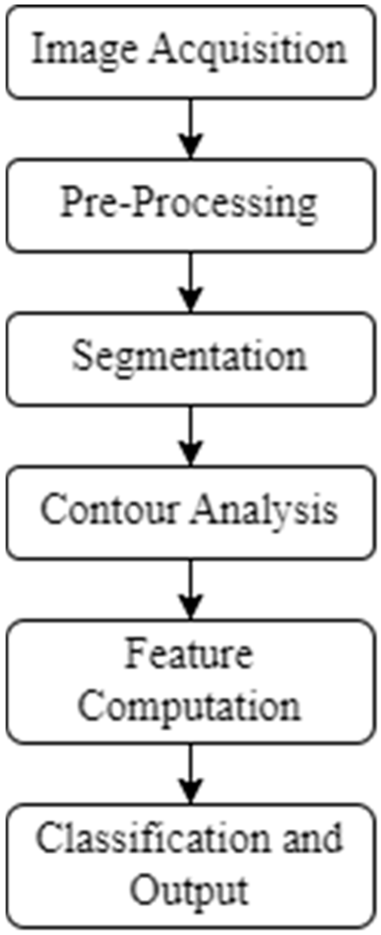 Contour detection: Adaptive thresholding with the Gaussian method (block size = 51 × 51; constant C = 2) and a 5 × 5 median filter was applied to minimize false edges on glossy or spotted shells.