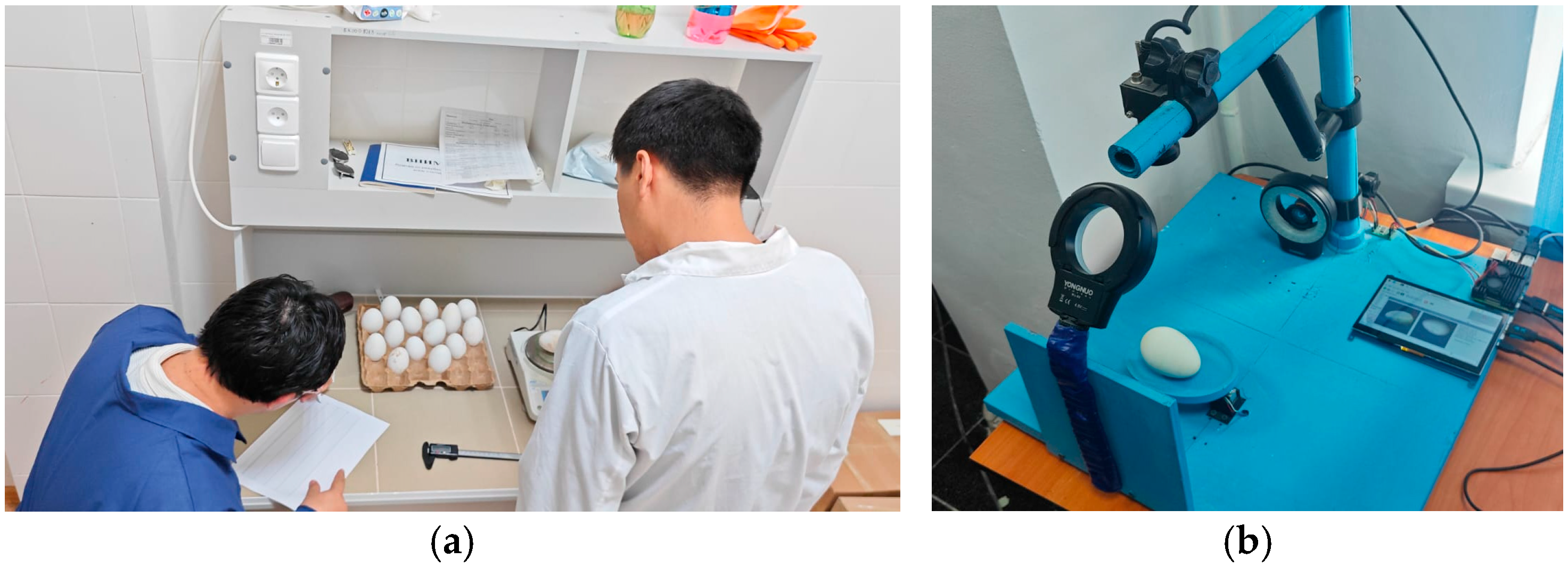 Considering the above, there is a clear need to develop a specialized automated method that is adapted to the morphological and physical–mechanical characteristics of duck eggs and capable of real-time non-destructive testing and precise sorting for incubation suitability. Such a method will improve reproductive performance, reduce the impact of the human factor and ensure digital control at the early stages of the production cycle. The creation of this method is one of the priority areas of the development of agricultural science, as outlined in the framework of the strategy for food security and the technological modernization of the agricultural sector.