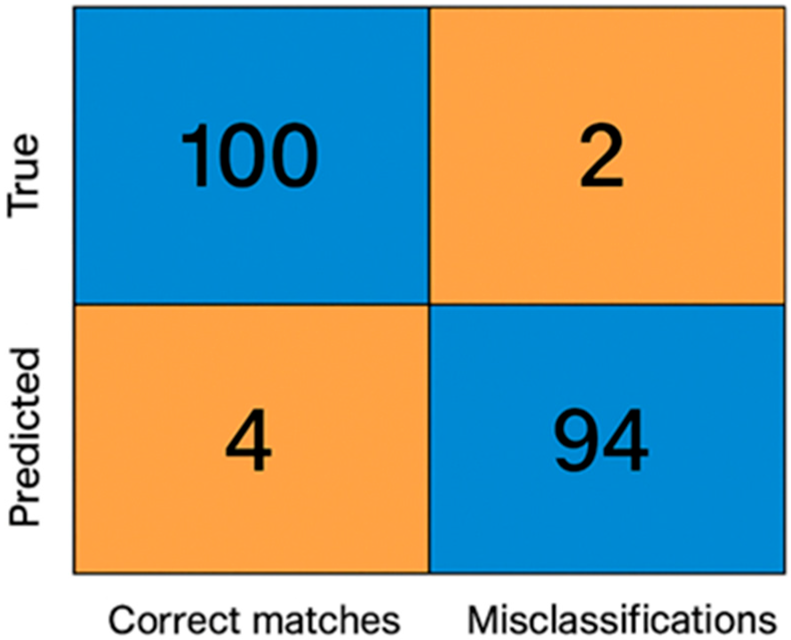 From this matrix, the overall accuracy (Acc = (TP + TN)/N) was calculated as 97.7%, precision = 96.5% and recall = 97.3%. These values confirm the system’s robust agreement with expert assessment.