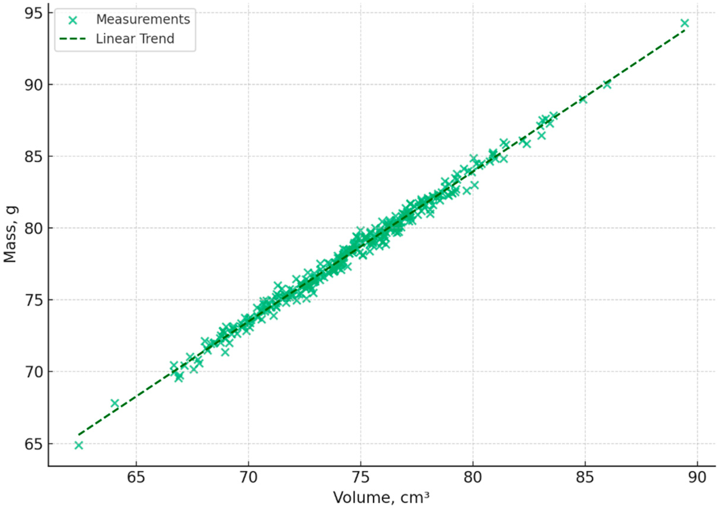 The mass–volume diagram shows a linear relationship corresponding to the classical physical formula for density; the main distribution of eggs by density lies within the range of 1.00–1.08 g/cm