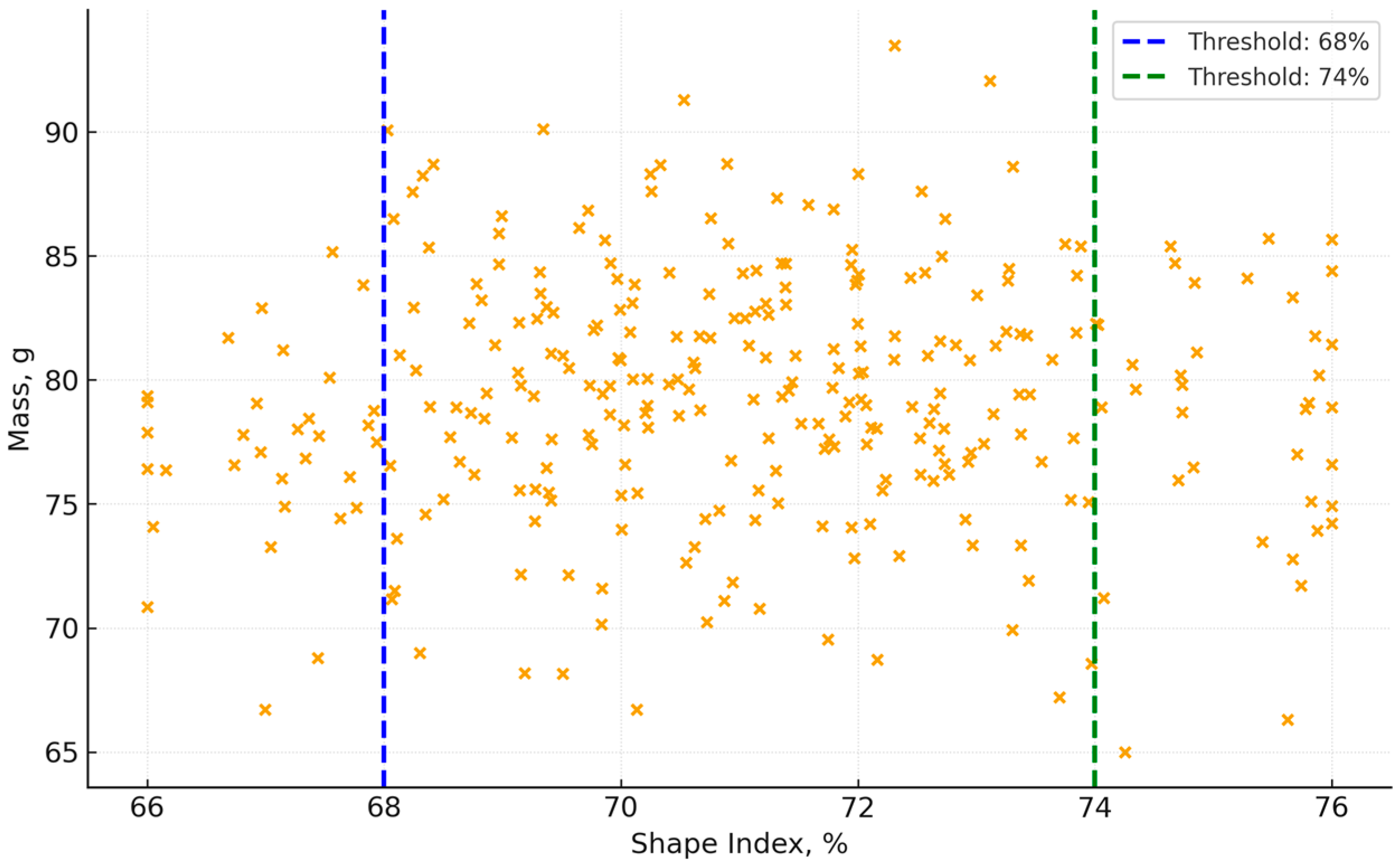 During the experiment, individual abnormal specimens were also identified, including suspected double yolks (based on a sharp increase in weight with normal geometry), non-standard ovality and excessively dense shells. All of them were correctly classified by the system as “borderline” or “unsuitable” based on deviations in two or more criteria.