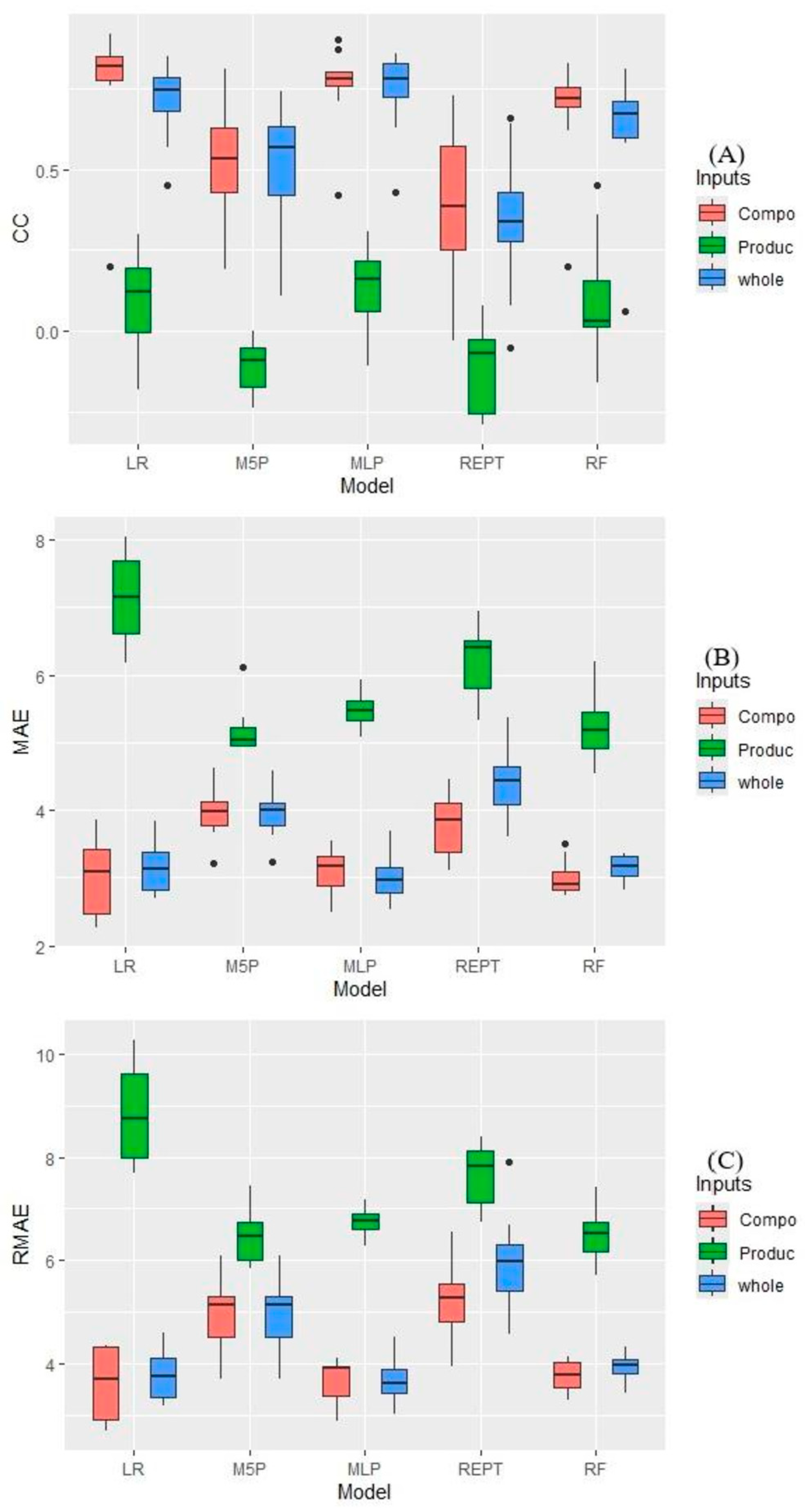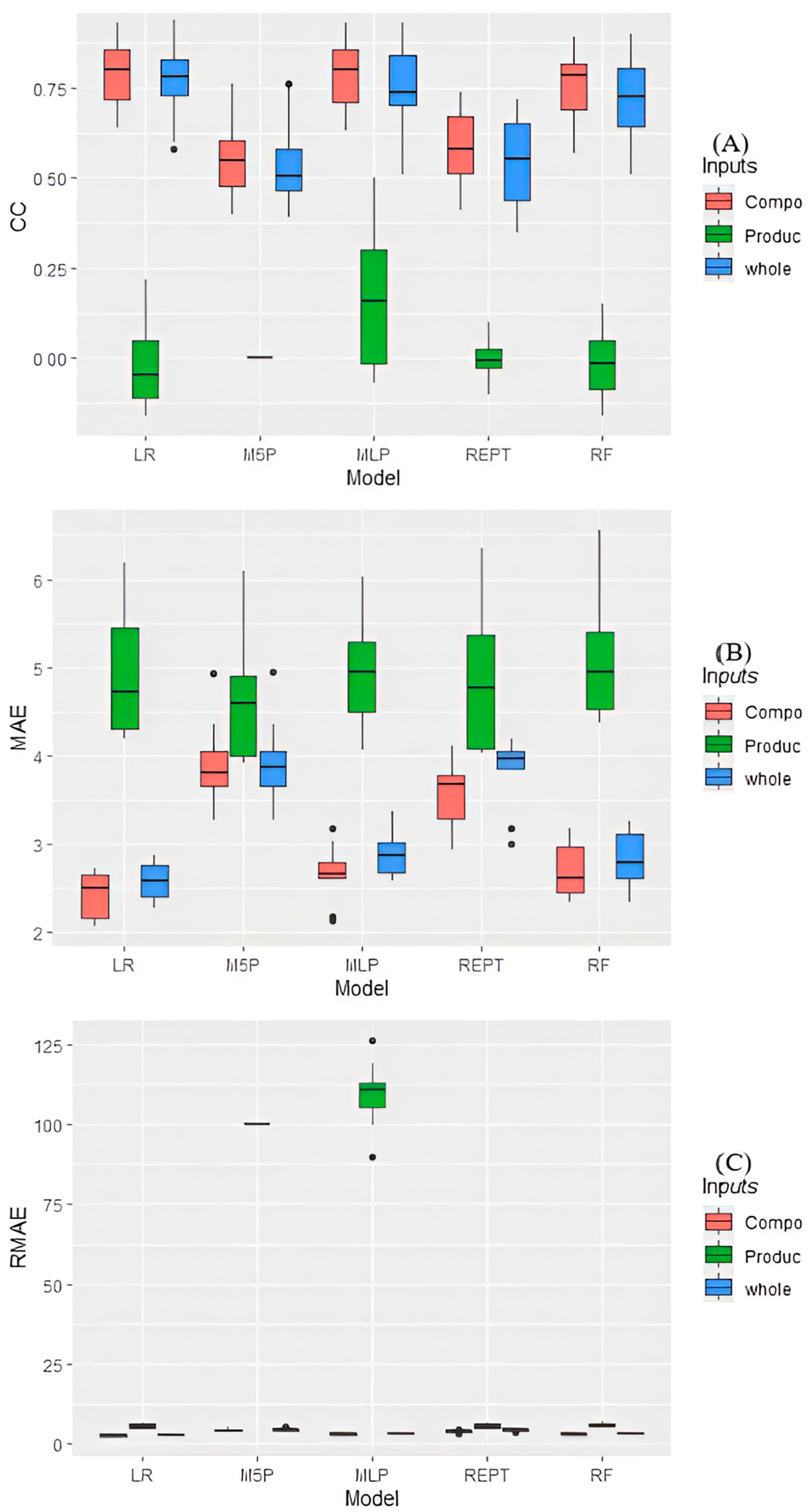 Figure 3. Boxplot showing the grouping of the mean correlation coefficient (CC) (A), mean absolute error (MAE) (B), and root mean absolute error (RMAE) (C) for the multilayer perceptron (MLP), REPTree (REPT), M5P, Random Forest (RF), and linear regression (LR) models in the prediction of the in vitro digestibility of Ipyporã grass leaf. Lowercase letters indicate differences in the same input data across models, while uppercase letters indicate differences in the input data within each model. Compo: Composition; Produc: Production and Whole: Composition and Production.