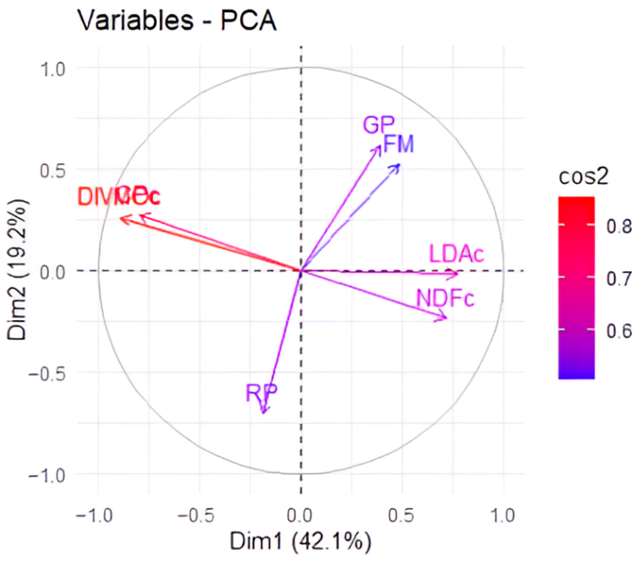 The PCA results showed that the majority of the variance in the dataset (61.3%) was explained by just two principal components (Figure 4). Digestibility showed a strong association with crude protein content and an antagonistic relationship with lignin and NDF data. Forage mass and grazing period were highly correlated and negatively associated with the rest period.
