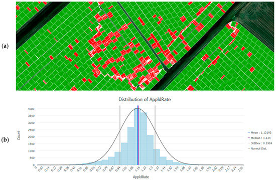 (a) Clearing of polygon-type yield data by filtering out features smaller than 30 m2 (removed data in red; cleared data in green); (b) The frequency distribution of the cleared data.