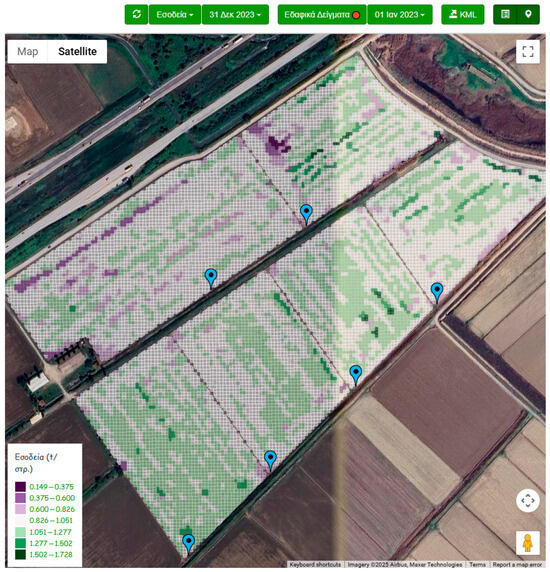 The final result of the protocol, enabled by the Data Visualization descriptor, is the seamless transfer and display of the processed, cleared, and calibrated yield maps on the ifarma FMIS platform in near real time (Figure 6). The active communication of the maps to the farmers allows them to enter the assessment procedure from very early, thus demonstrating the protocol’s direct application and practical value in operational farm management.