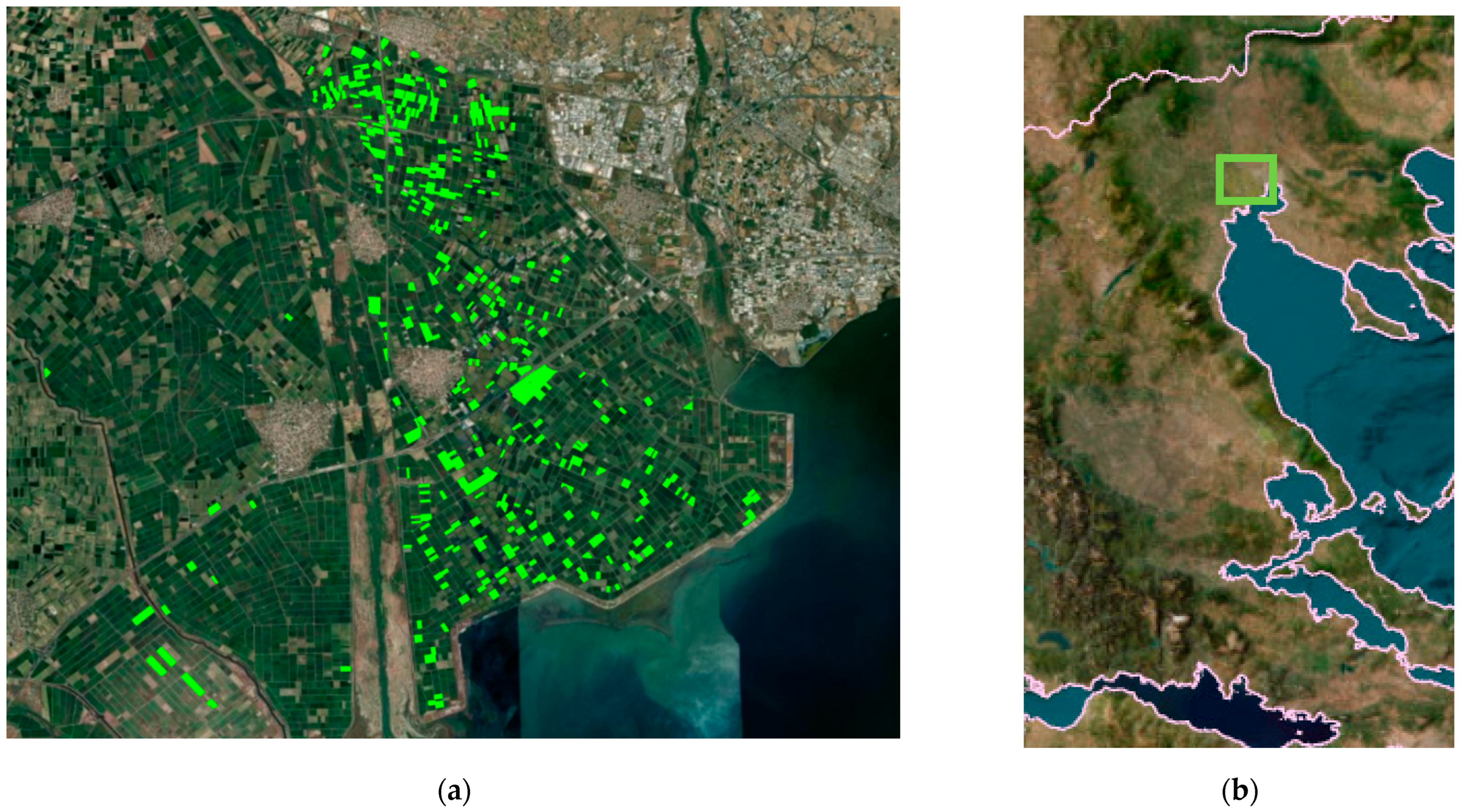 Figure 1. (a) Study fields (green polygons), mainly distributed in the eastern part of the Axios River Plain; (b) Axios River Plain (green box), located in the north part of Greece.