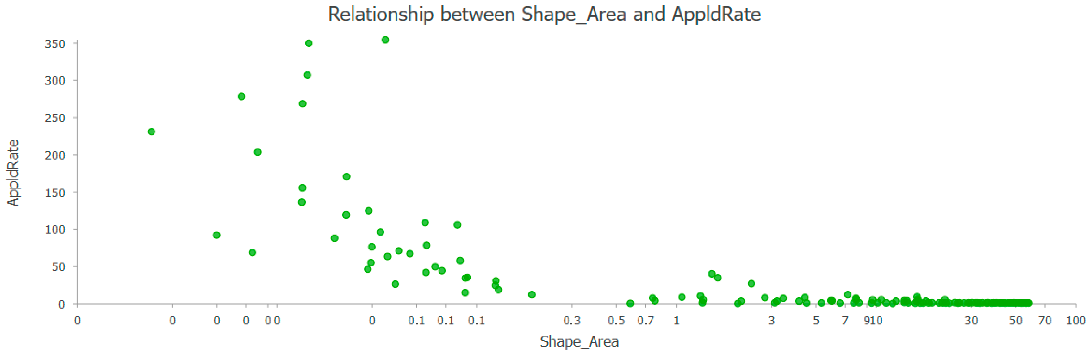 Figure 4. Scatter plot of yield (“AppldRate”) vs. area (“Shape_Area”), in which a 30 m2 area-value appears to be the low threshold for normal yield values.