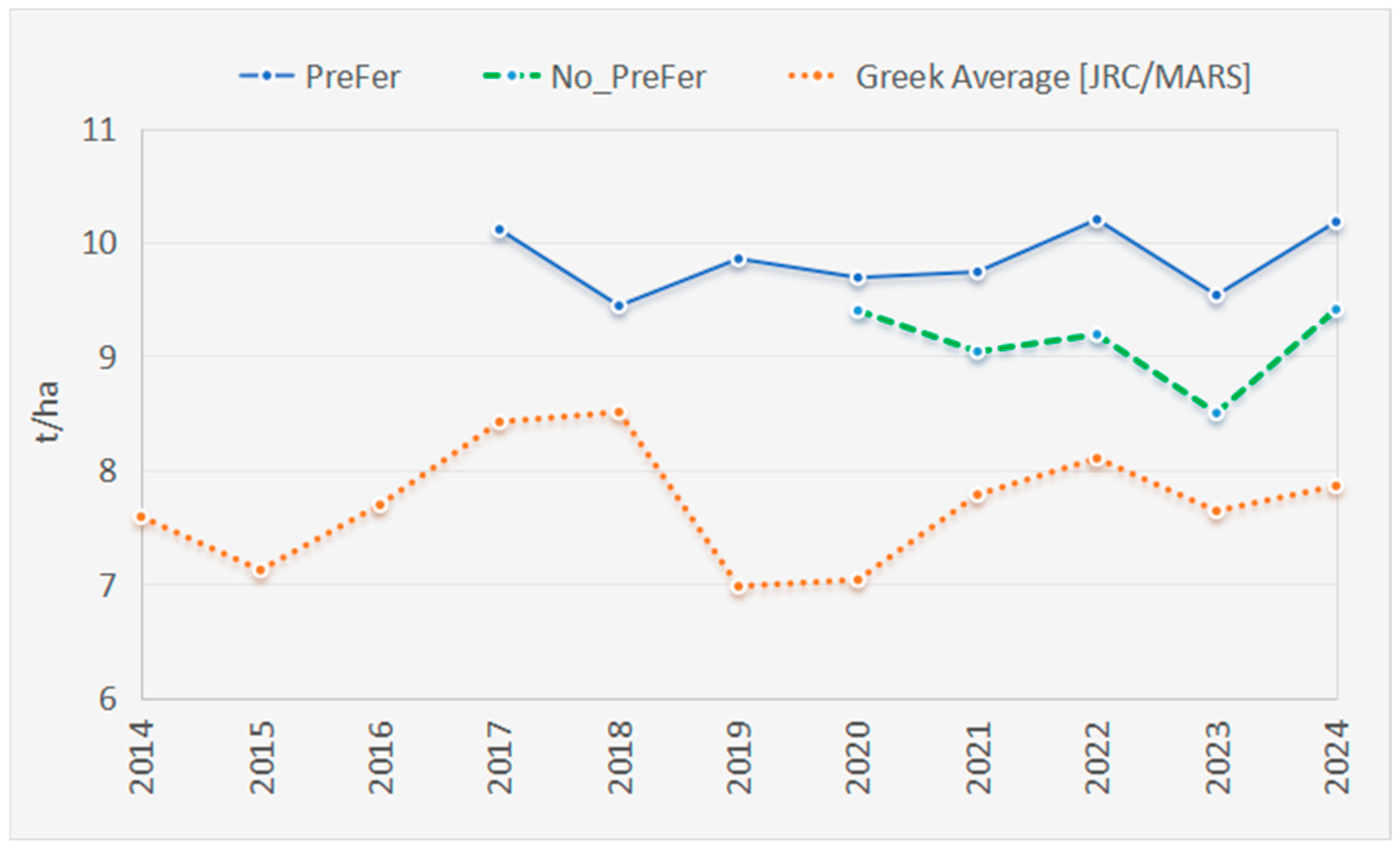 Figure 7. Yield average values plotted against years for different farmer groups: PrecAg (implementing precision fertilization), Non-PrecAg (not implementing precision fertilization), and the Greek average (as reported by JRC/MARS).