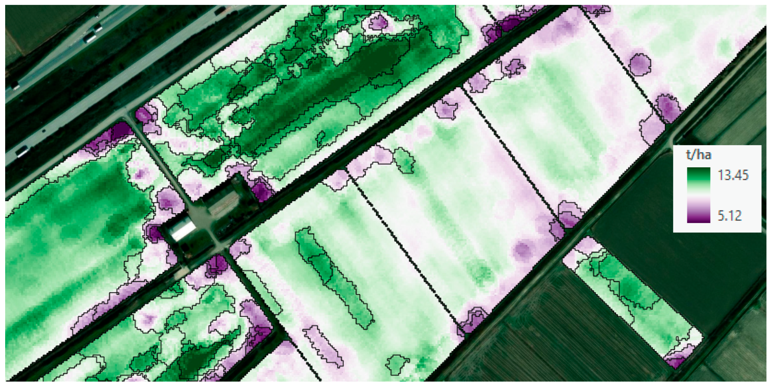 The removal of these abnormal values was essential for sound analysis. The specific thresholds were determined using a trial-and-error approach to approximate a quasi-normal distribution. An upper threshold was generally set at 20 tonnes per hectare (t/ha). Notably, the initial filtering of small polygon features (those less than 30 m2) had already partially addressed the high-value outliers in the polygon data set. The determined upper threshold of 20 t/ha was verified by local historic data and the experience of the farmers. These findings are also in accordance with the globally reported theoretic and achieved figures, which all are found below 20 t/ha [24].