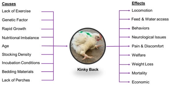 The global poultry industry has experienced significant growth over the past few decades, primarily driven by rising demand for affordable animal protein [1,2]. This surge has been further supported by technological innovations and improved farming techniques that enhance production efficiency. Advances in genetic selection, nutrition, and management practices have contributed to the development of fast-growing broiler chickens [3]. Compared with chicken meat in the 1950s, modern broilers have doubled body mass in half the production time [4]. However, this rapid growth has inadvertently introduced health concerns that negatively affect animal health, productivity, and welfare, including myopathies (woody breast, spaghetti meat) [5,6] and skeletal issues, such as lameness [7,8]. Among skeletal disorders affecting modern broilers, spondylolisthesis is particularly concerning [9]. Spondylolisthesis is a physical disorder that is commonly referred to as a Kinky Back (KB). In addition, KB symptoms can be a manifestation of bacterial infection of the fourth thoracic vertebra (T4), known as spondylitis [10,11,12]. KB has garnered increasing attention due to its impact on broiler welfare and production efficiency (Figure 1). It is characterized by deformities of the thoracic vertebrae, leading to spinal cord compression, gait abnormalities, and, in some cases, paralysis [13]. Affected birds often struggle to access feed and water, contributing to poor performance and increased mortality [14].