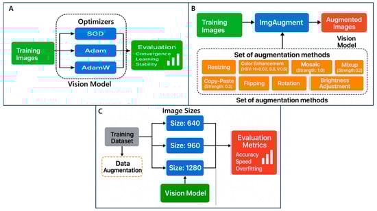 Several open-source deep learning models were initialized in their default configurations to establish baseline performance. Improving model accuracy and robustness required careful selection of optimizers and augmentation techniques during training (Figure 4). This study evaluated various optimizers (Stochastic Gradient Descent, Adam, and AdamW) and augmentation techniques (image size, stronger color, and aggressive augmentations) to determine the most effective combination for improving model performance. These optimizers were used to understand how each optimizer affected convergence, learning stability, and final accuracy [41]. For instance, Adam and AdamW adapt the learning rate during training, potentially improving convergence on complex datasets [42,43], whereas SGD often leads to better generalization [44,45]. In addition, various data augmentation techniques were also applied, including resizing input images (640, 960, 1280), enhancing color variations (hsv_h = 0.02; hsv_s = 0.8; hsv_v = 0.5), and using stronger augmentations such as mosaic, mix-up, flipping, rotation, and brightness adjustment. These augmentations enhance data diversity, enabling the model to generalize more effectively and avoid overfitting [46]. In addition, the reason for using different image sizes is that YOLO models usually use a 640 image size and other arguments by default. Therefore, this study wants to compare the default setting with other settings. Based on prior findings, improved performance is achieved with increased training epochs of 200 and a batch size of 16 [47].
