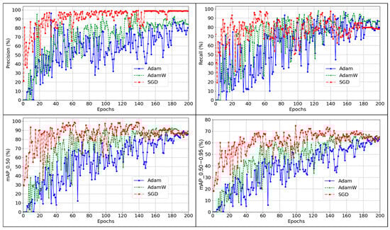 This study compares the performance of three optimizers (Adam, AdamW, and SGD) for detecting KB using a YOLO-based deep learning model. The results showed that SGD performed the best overall as shown in Table 1 and Figure 5. It achieved the highest precision, mAP_0.50, and mAP_0.50–0.95 among the three. While AdamW had slightly higher recall and F1-score, SGD showed stronger overall detection accuracy and localization. High precision means the model made fewer false detections, which is essential in real-time applications. High precision is critical in commercial settings to avoid unnecessary inspections, reduce labor costs, and prevent alert fatigue. A higher mAP_0.50–0.95 also suggests that the model trained with SGD was better at identifying and localizing different variations in the target condition. Previous studies in poultry detection mostly used Adam, AdamW and SGD optimizers [49]. Using SGD reported significantly higher generalization than Adam [49,50]. Figure 4 shows similar results, with the SGD optimizer outperforming the Adam optimizer. The SGD optimizer consistently demonstrated improved performance, whereas other optimizers showed fluctuating trends and less stable convergence. Model performance improves as the number of epochs increases from epoch 0 to 200. This shows the importance of selecting the right optimizer based on the detection goal.