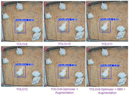 The global poultry industry faces growing challenges from skeletal disorders, with Kinky Back (KB) significantly impacting broiler welfare and production. KB causes spinal deformities that reduce mobility, feed access, and increase mortality. It often remains undetected in early subclinical stages. Traditional KB diagnosis methods are slow and subjective, and highlighting the need for an automated and objective detection. This study develops a machine learning approach for detecting KB in broilers using image data. Male Cobb 500 broilers were raised under controlled conditions and monitored over 7 weeks using overhead 4K video cameras. Behavioral and posture data related to KB were collected and annotated from images extracted from the videos. First, various optimizers (SGD, Adam, AdamW), image sizes, and data augmentation techniques were compared, and the best-performing optimizer, image size, and data augmentation technique were identified. These findings were then used to compare different original lightweight YOLO models trained and to identify the best models with further modifications to these configurations, aiming to improve detection accuracy. Different machine vision models were evaluated using precision, recall, F1-score, and mean average precision metrics to identify the best-performing approach. Among the tested optimizers, SGD achieved the highest precision (100%) and mAP_0.50–0.95 (74.7%), indicating superior localization and lower false-positive rates, while AdamW produced the highest recall (98.9%) with slightly lower precision. Image input size of 960 × 960 pixels yielded the best balance of precision (99.0%), recall (99.4%), and F1-score (99.2%). Data augmentation improved recall and reduced false negatives by confirming its value in enhancing model generalization. Among YOLO architectures, YOLOv9 performs best. Furthermore, the optimized YOLOv9 model, combined with augmentation and 960-sized images, achieved the highest performance, with a precision of 99.1%, recall of 100%, F1-score of 99.5%, and mAP of 78.0%. Overall, the proposed optimized YOLOv9-based system provides a reliable and scalable framework for automated detection of Kinky Back, supporting data-driven welfare management in modern poultry production.