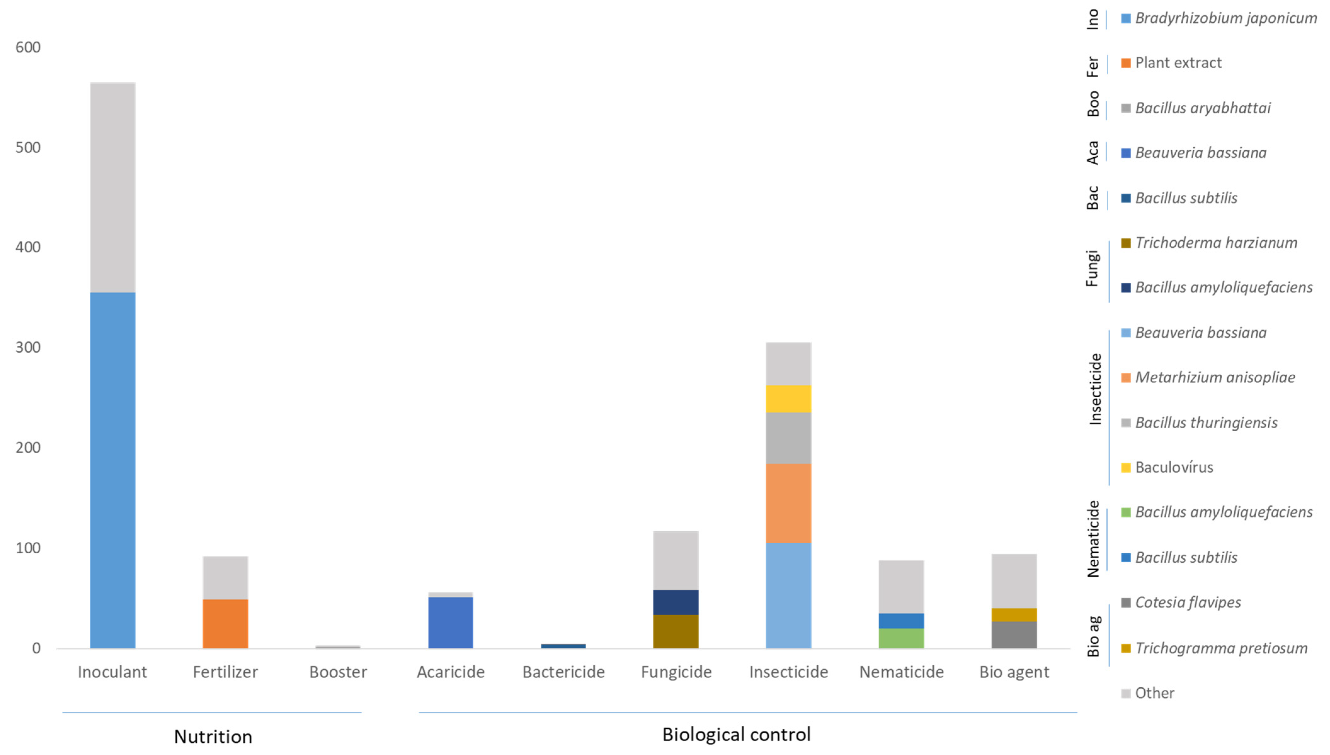 - Fischer, H.; Marcondes de Almeida, J.E.; Limberger, C.; Harakava, R.; Sato, M.E.; Costa, V.A.; Schoeninger, K.; Leite, L.G.; Chacon-Orozco, J.G.; Baldo, F.B. The Rise of Bioinputs in the Brazilian Agri-Industry: Trends, Cases and Hurdles. Outlooks Pest Manag. 2023, 34, 106–118. [Google Scholar] [CrossRef]