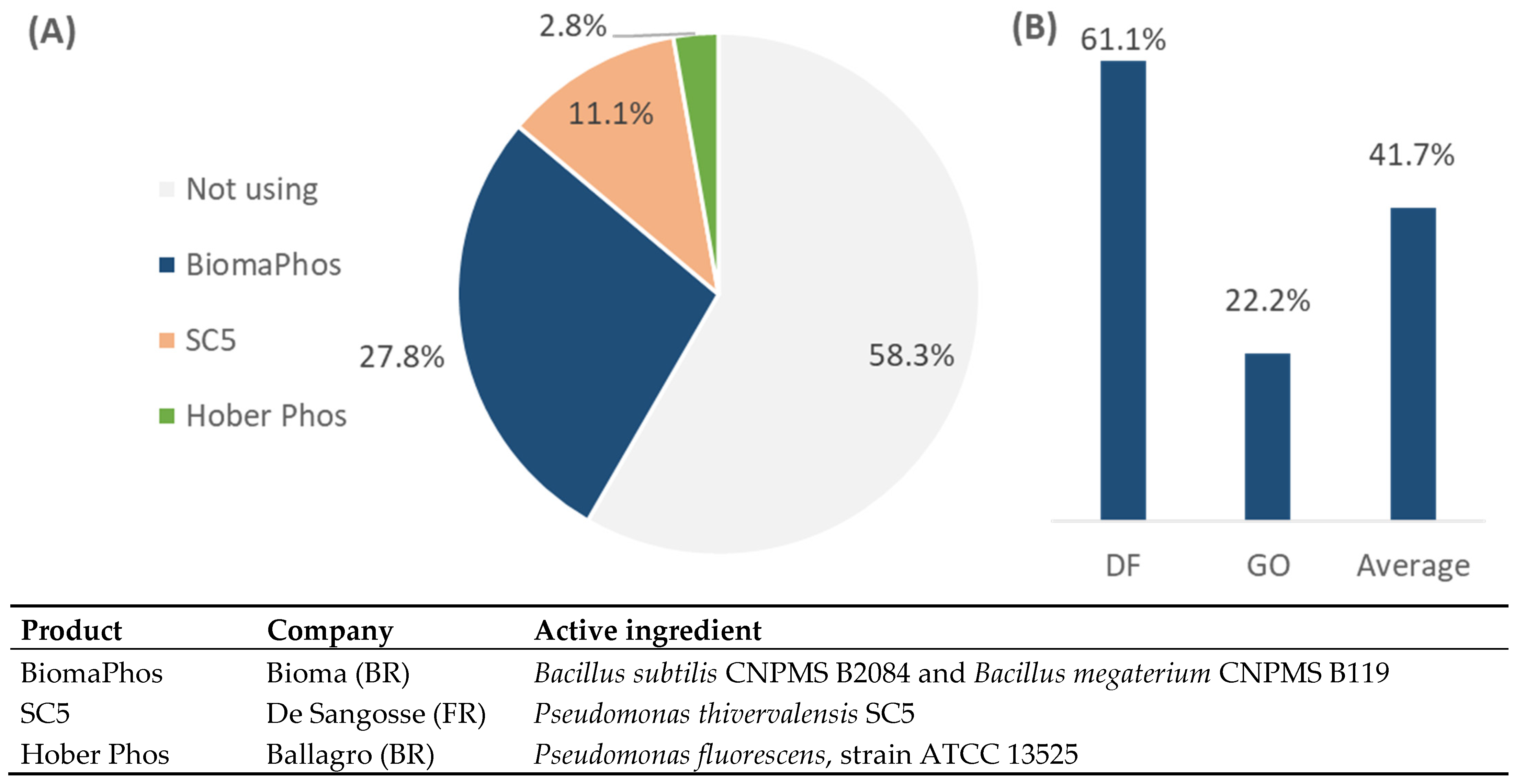 | Biofree | Biotrop (Vinhedo, SP, Brazil), now part of the Belgian group BioFirst | Azospirillum brasilense Ab-V6 Pseudomonas fluorescens CCTB03 | - | Phosphorus and nitrogen bioavailability |