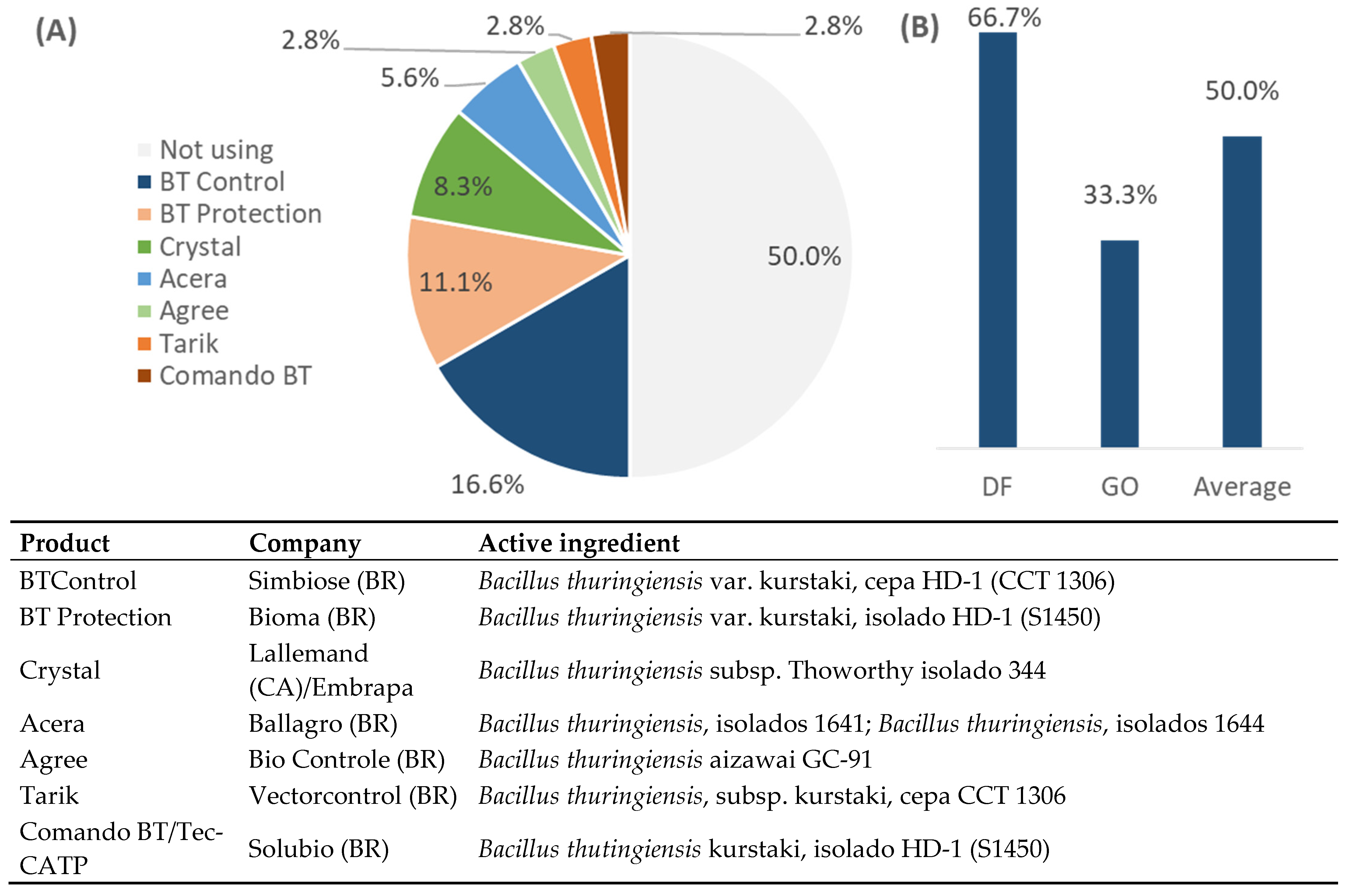 | Crystal | Lallemand (in partnership with Embrapa) (Toronto, ON, Canada) | Bacillus thuringiensis subsp. Thoworthy isolated 344 | Spodoptera frugiperda |
