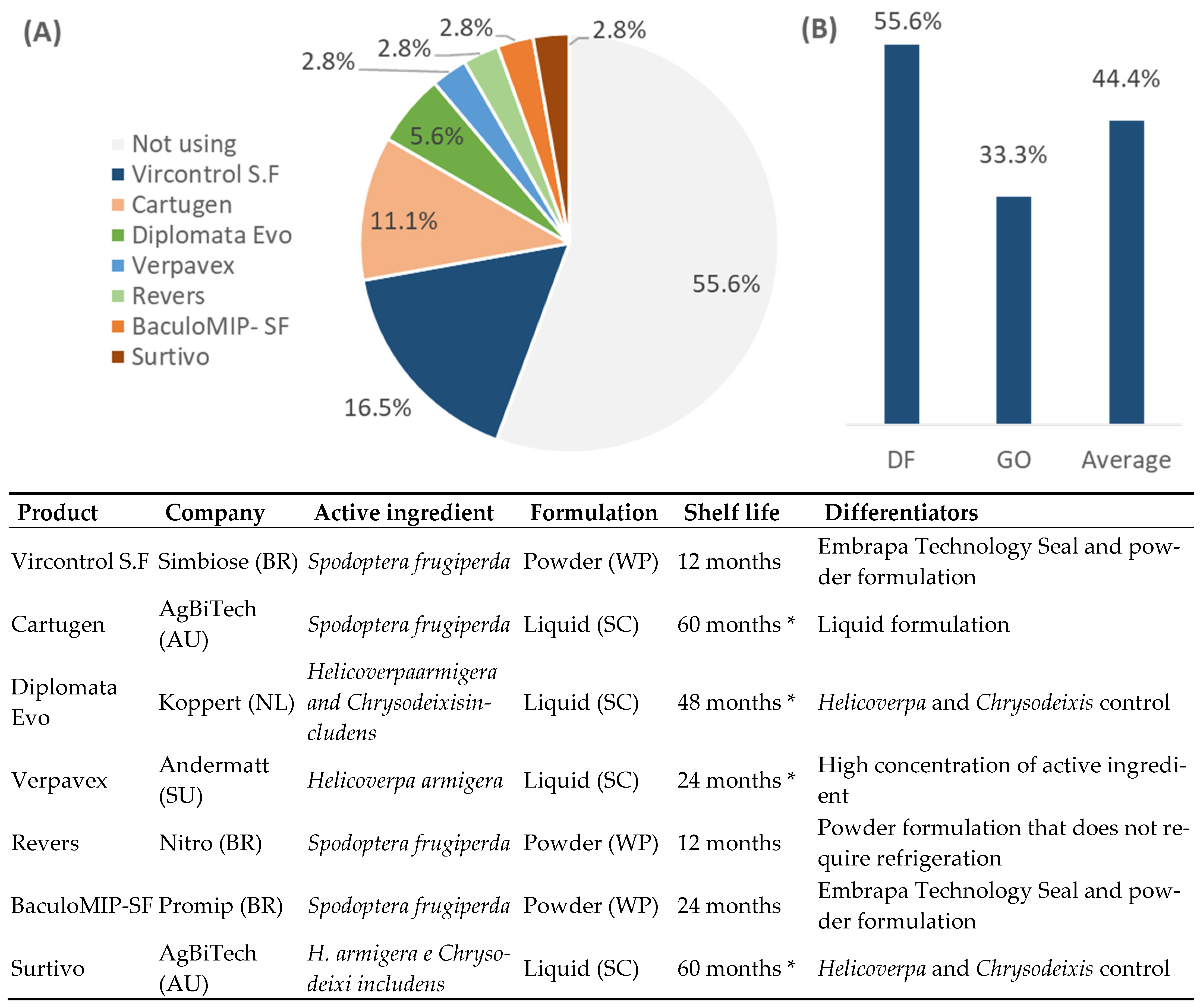 | VirControl SF | Simbiose (Cruz Alta, RS, Brazil) | Spodoptera frugiperda multiplenucleopolyhedrovirus (SfMNPV) | Spodoptera frugiperda |