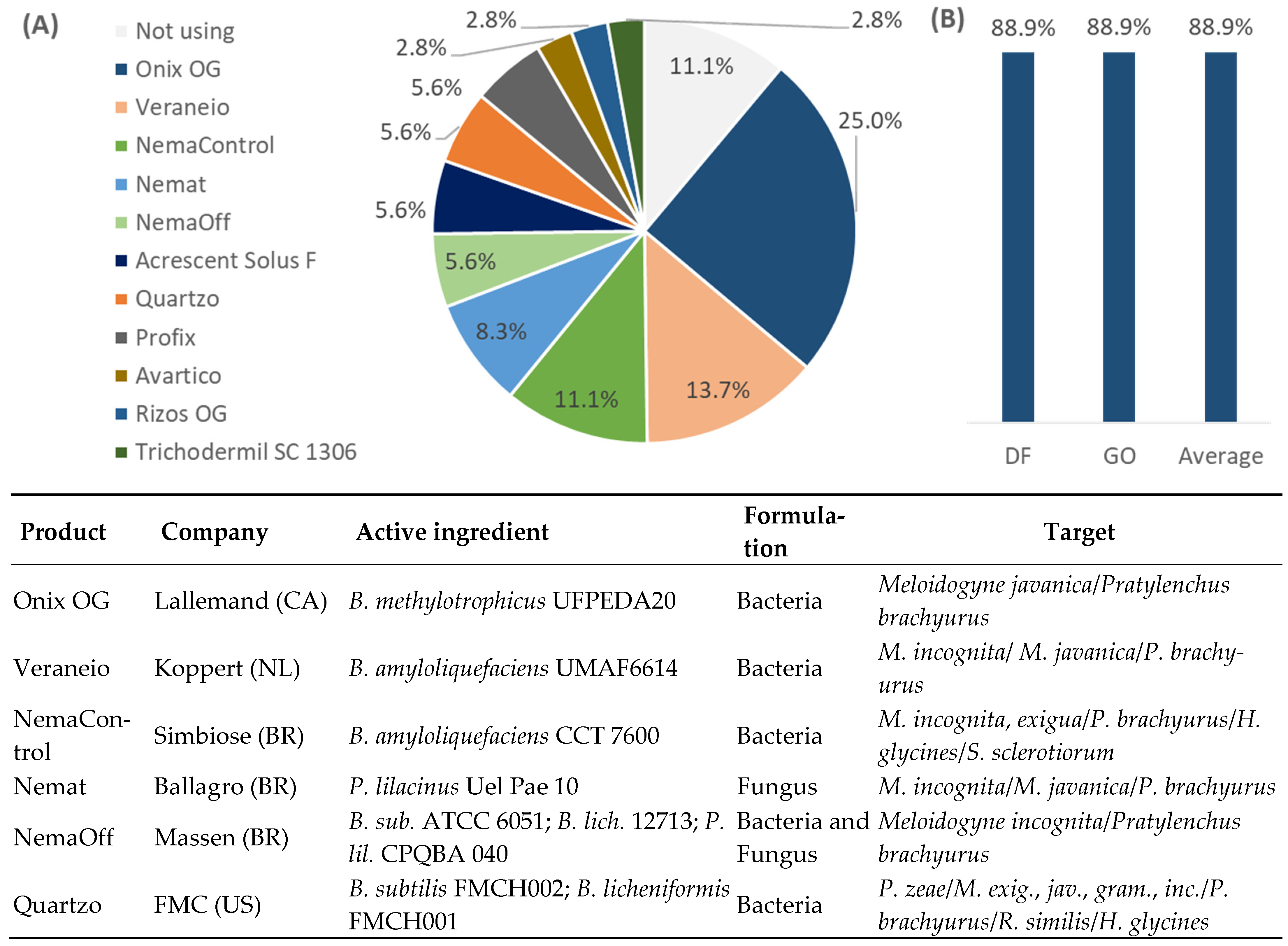| NemaOff/Bionexus/ Volga CI/AgDommon | Massen (Indaiatuba, SP, Brazil) | Bacillus subtilis, strain ATCC 6051; Bacillus licheniformis, strain ATCC 12713; Paecilomyces lilacinus, strain CPQBA 040-11 DRM 10 (bacteria and fungus) | Meloidogyne incognita/Pratylenchus brachyurus |