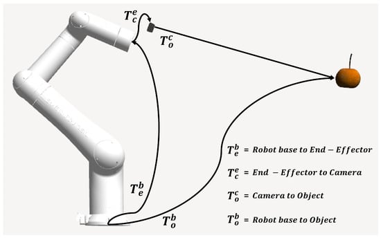 In robotic manipulation, hand–eye calibration is critical for aligning the camera coordinate system with the robot base coordinate system. Without this calibration, the 3D positions of detected fruits cannot be accurately mapped to the manipulator’s workspace. The hand–eye transformation is typically represented by a homogeneous transformation matrix that describes the pose of the camera relative to the robot base. This transformation can be formulated as